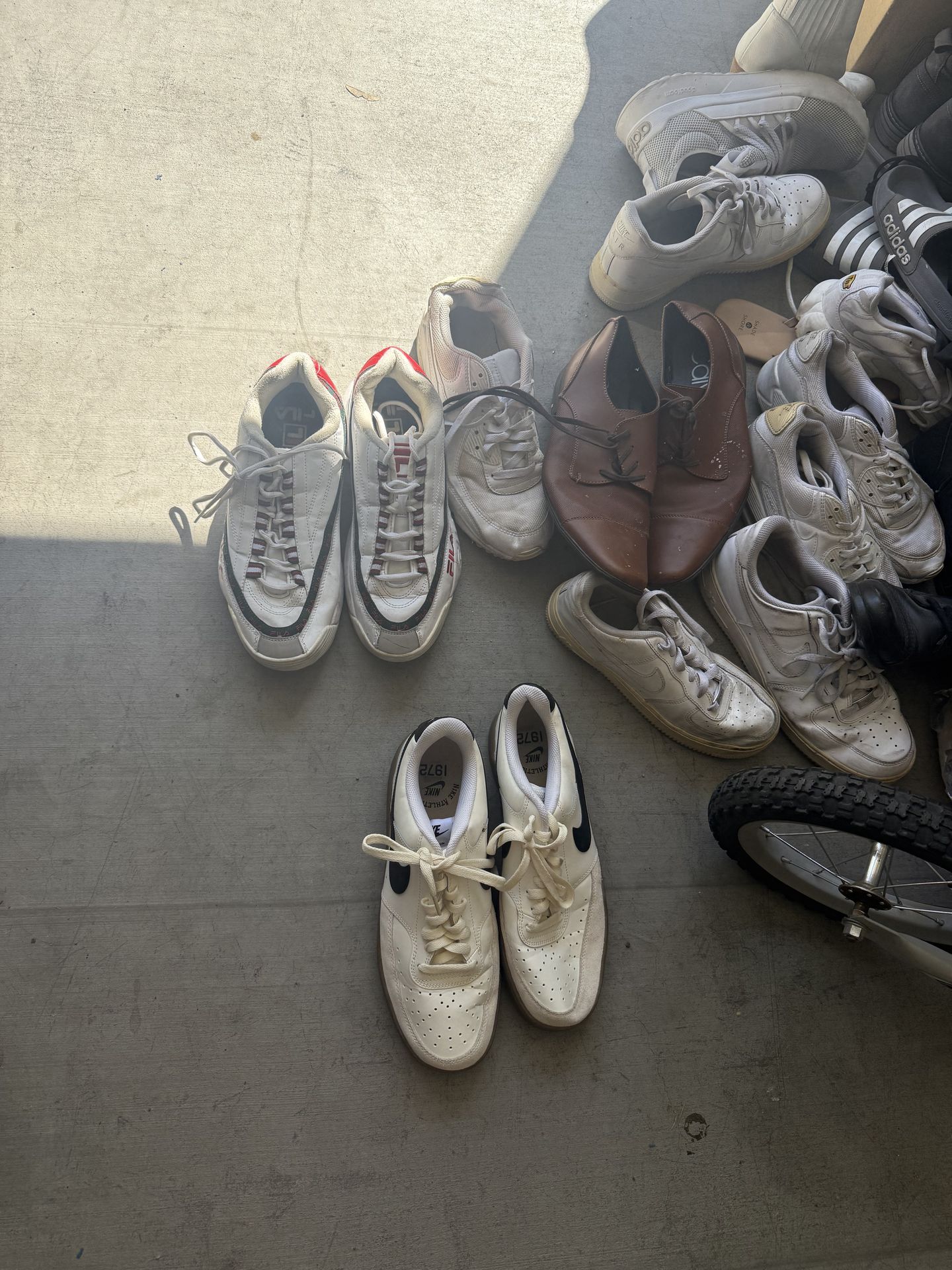 I have a couple pairs of men shoes available. Size 10.5 / 11. For the Nike w brown bottom and green/red files those are $10 each (these have only been worn very few times) If you see any other pairs you like, you can take for $5 a pair Calvin Klein are not available