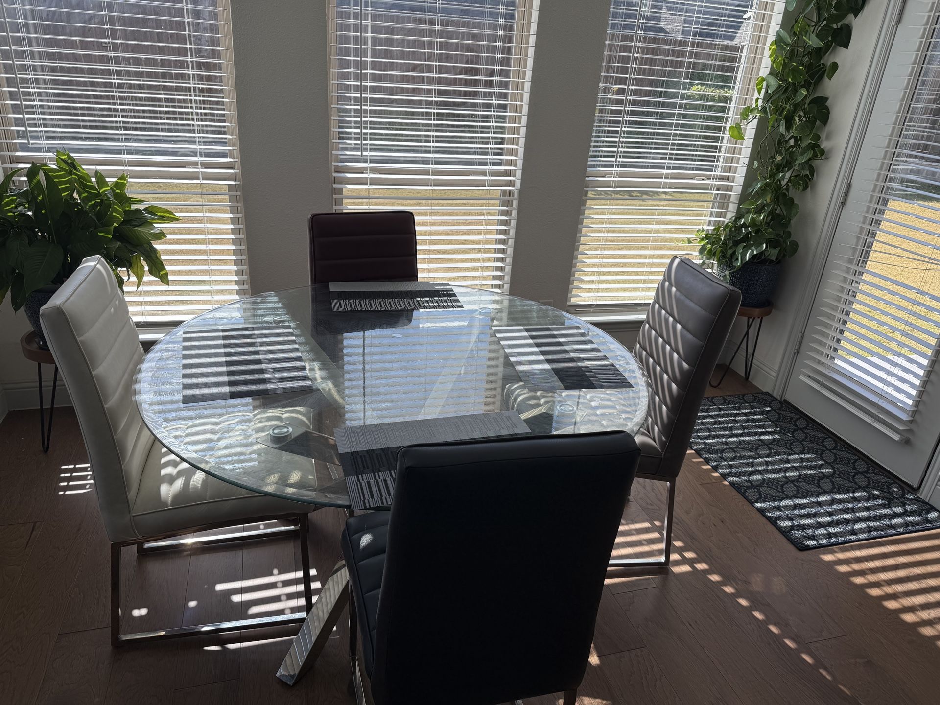 Linton park silver round dining table and chairs set Like new and you will see the same exact condition and look like in the pictures Dining table brought for $500 + tax Each chair brought for $170 each (4 chairs $680 + tax ) Asking for $650 for both Dining table and 4 chairs Everything looks like new. Dimensions: Dining table - 54"diameter x 30"h Chair - 17.00"w x 22.00"d x 40.00"h