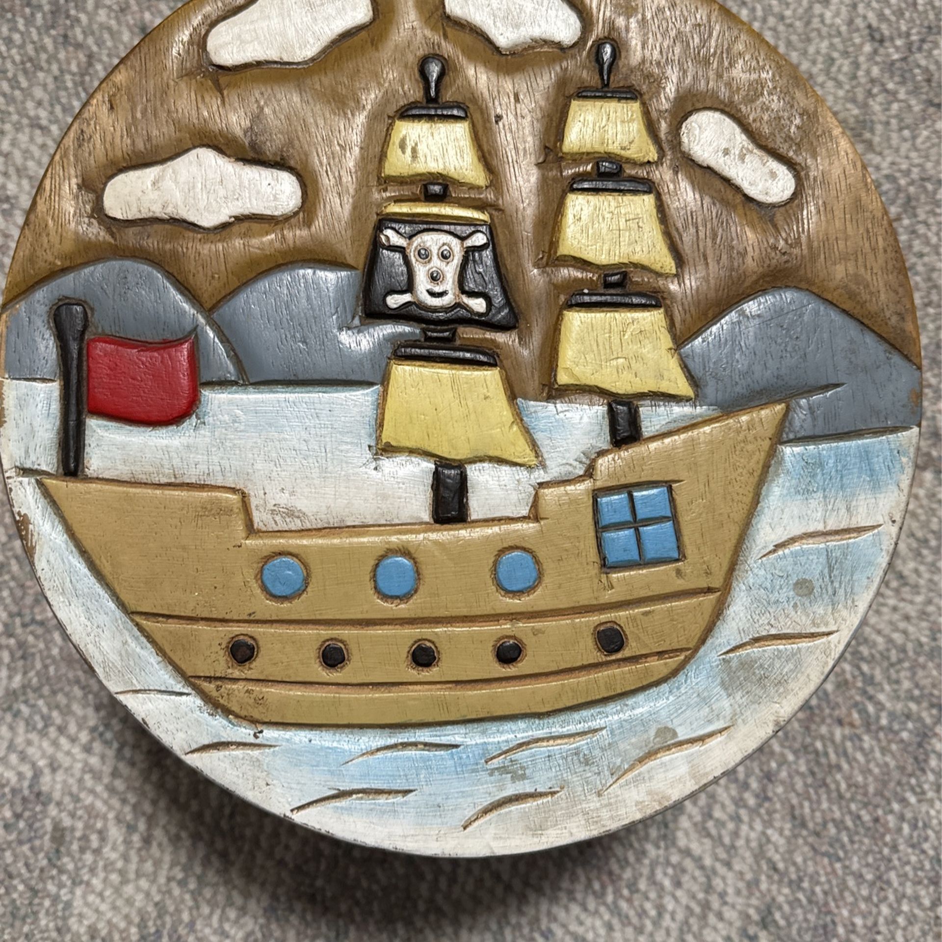 Pirate ship step stool. Carved and painted top makes it less slippery. Pictured with a standard roll of paper towels for size comparison.