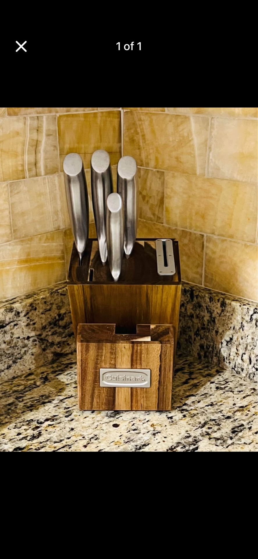 Brand new Cuisinart 7pc Stainless Steel Essentials Block Set with Built in Sharpener. Set Includes: 8” Chef Knife 8” Slicing Knife 7” Santoku Knife 5.5” Serrated Utility Knife Acacia Wood Block with Built in Sharpener Scissors and a paring knife came damaged. Hence they will not be included. Also, missed the return window. Other than those two the set is New and never used. Pickup in Ashland.