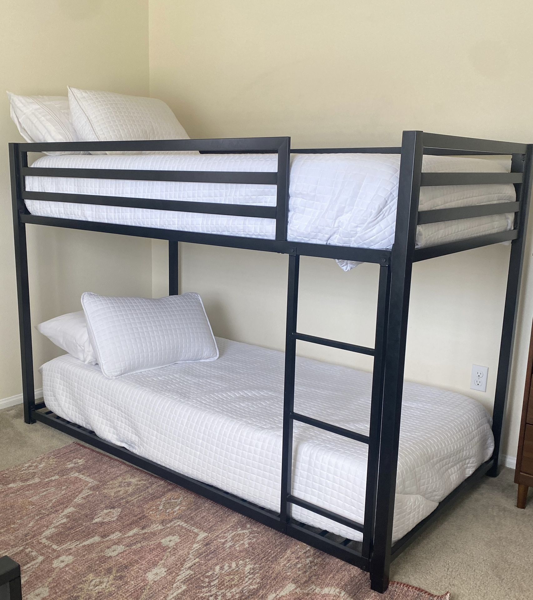 Low Metal Bunk Bed Frame, With Built-in Ladder, High Guardrail and Metal Slats, Floor Bed Bottom Bunk, No Boxspring Required, For Small Spaces, Twin-Over-Twin. 77.5" L x 41.5” W x 54” H **Can include twin mattresses for an additional $100 each (original cost $299). 10” medium memory foam mattress - In great condition, mattress protector always on. This was my guest bedroom.