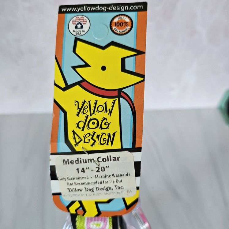 Yellow Dog Design Name on collar: Daisy Color: Lime green, with pink letters Adjustable Dog Collar Size: Medium 14"- 20" Machine washable
