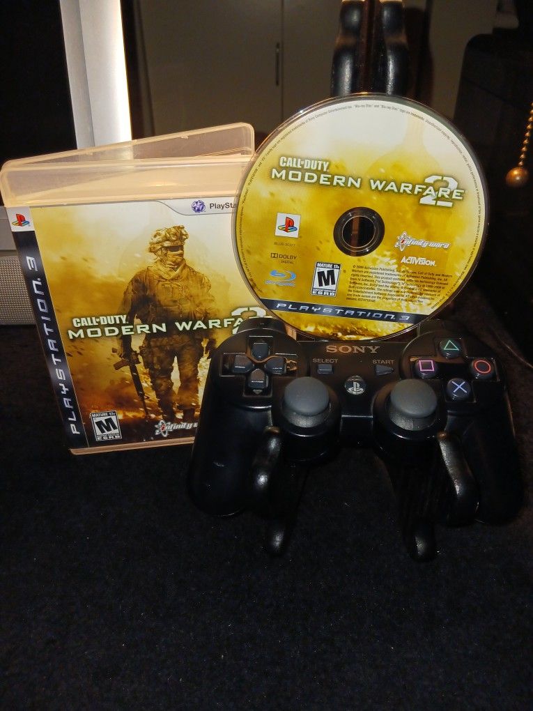 PlayStation 3 DualShock/Official Controller jet black has original PlayStation serial number /model number sticker on back no stick drift all buttons work flawlessly and effortlessly like they should plus Modern Warfare 2 with complete booklet manual original artwork box and disc and I will throw in a charging cord (at asking price) all items are official PlayStation releases and in excellent condition these items are from a smoke-free home. All authenticated tested and working $50 cash only, please, also no trades and local pickup only!