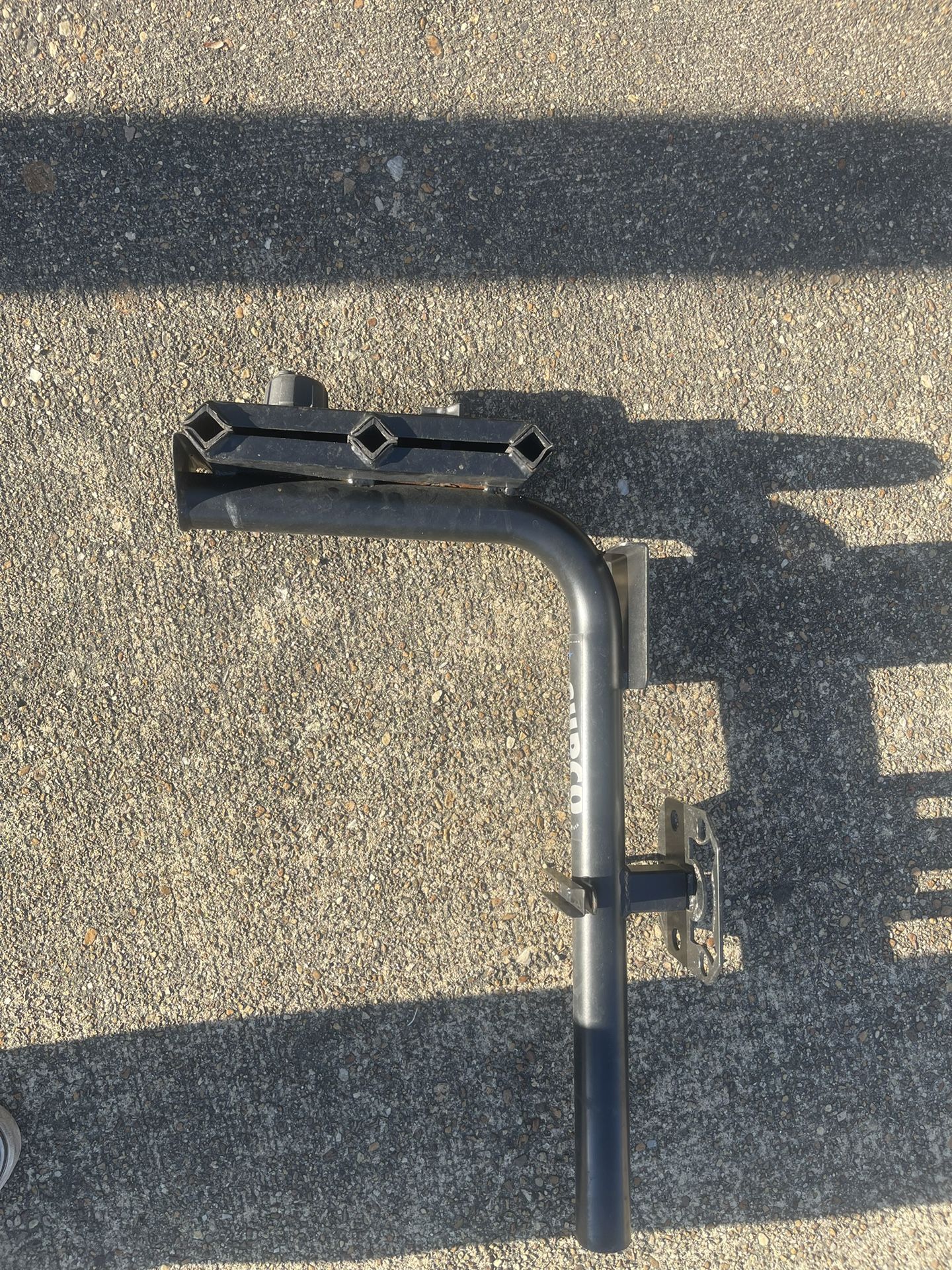 Bolts to 5th wheel on the back of a suv, holds 2 to 3 bikes depending on size. Has lock built into the top.