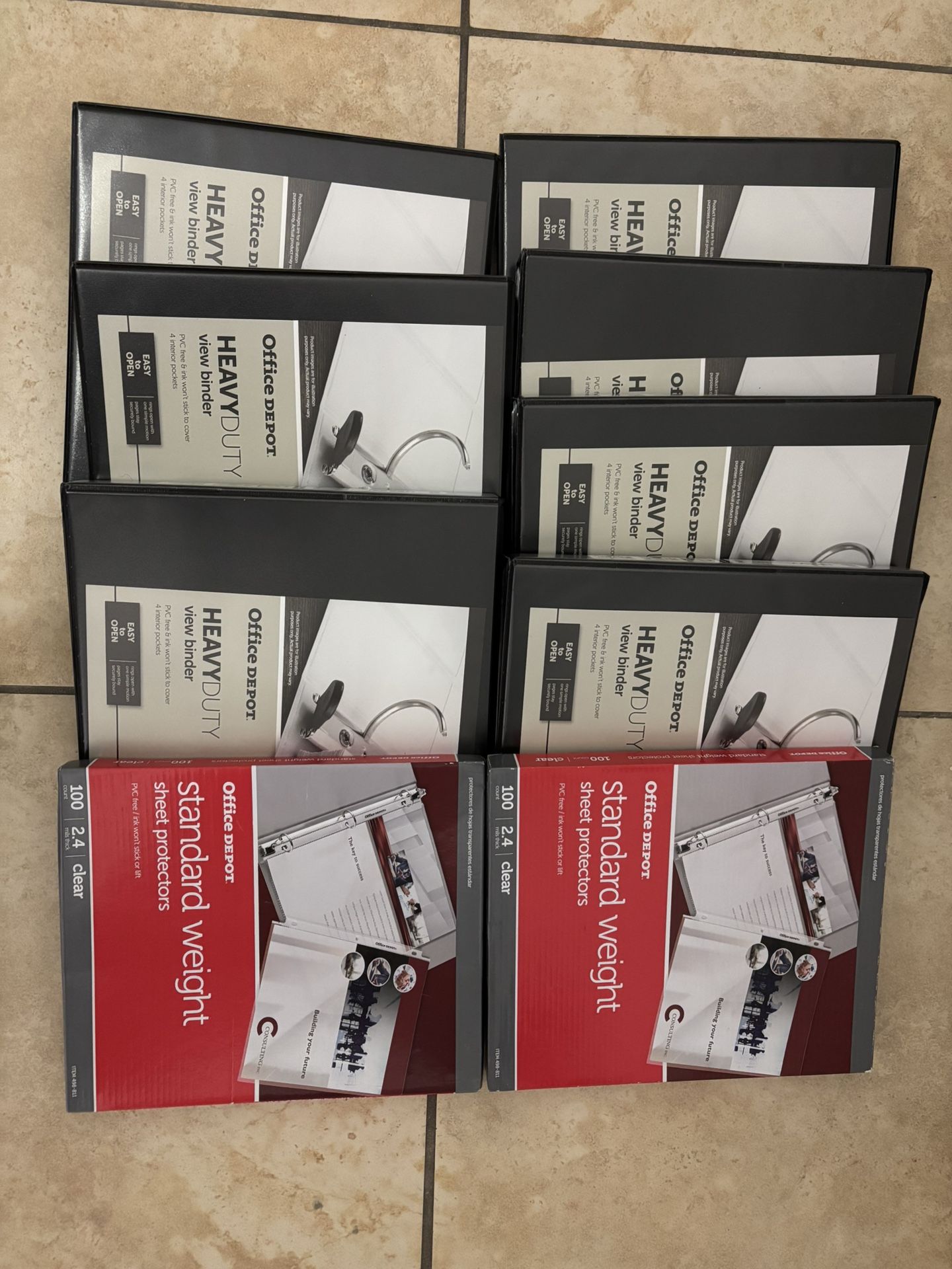7 durable ring binders and 2 packs of sheet protectors (100 sheets each, standard thickness) are brand new and have never been used.