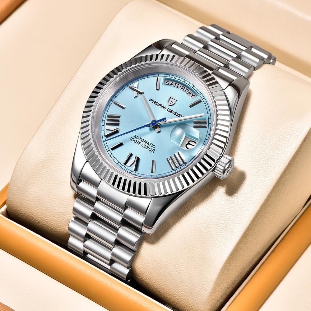 Pagani Design PD-1752, un modelo automático que rinde homenaje al clásico diseño "Day-Date". Este reloj destaca por su esfera de color azul cielo ("Sky Blue") y su brazalete estilo presidente en acero inoxidable. Especificaciones Principales Movimiento: Automático, comúnmente equipado con el calibre Seagull ST16 o el japonés NH36A (como se indica en el texto de tu imagen). Cristal: Cristal de zafiro sintético, conocido por su alta resistencia a los arañazos. Resistencia al Agua: Hasta 100 metros (10 bar), lo que lo hace apto para el uso diario y natación ligera. Dimensiones: El modelo PD-1752 estándar suele ser de 36 mm, aunque existen variantes de 40 mm (a menudo referenciadas como PD-1783). Funciones: Ventana de día curvada a las 12 en punto y ventana de fecha con lupa a las 3 en punto.