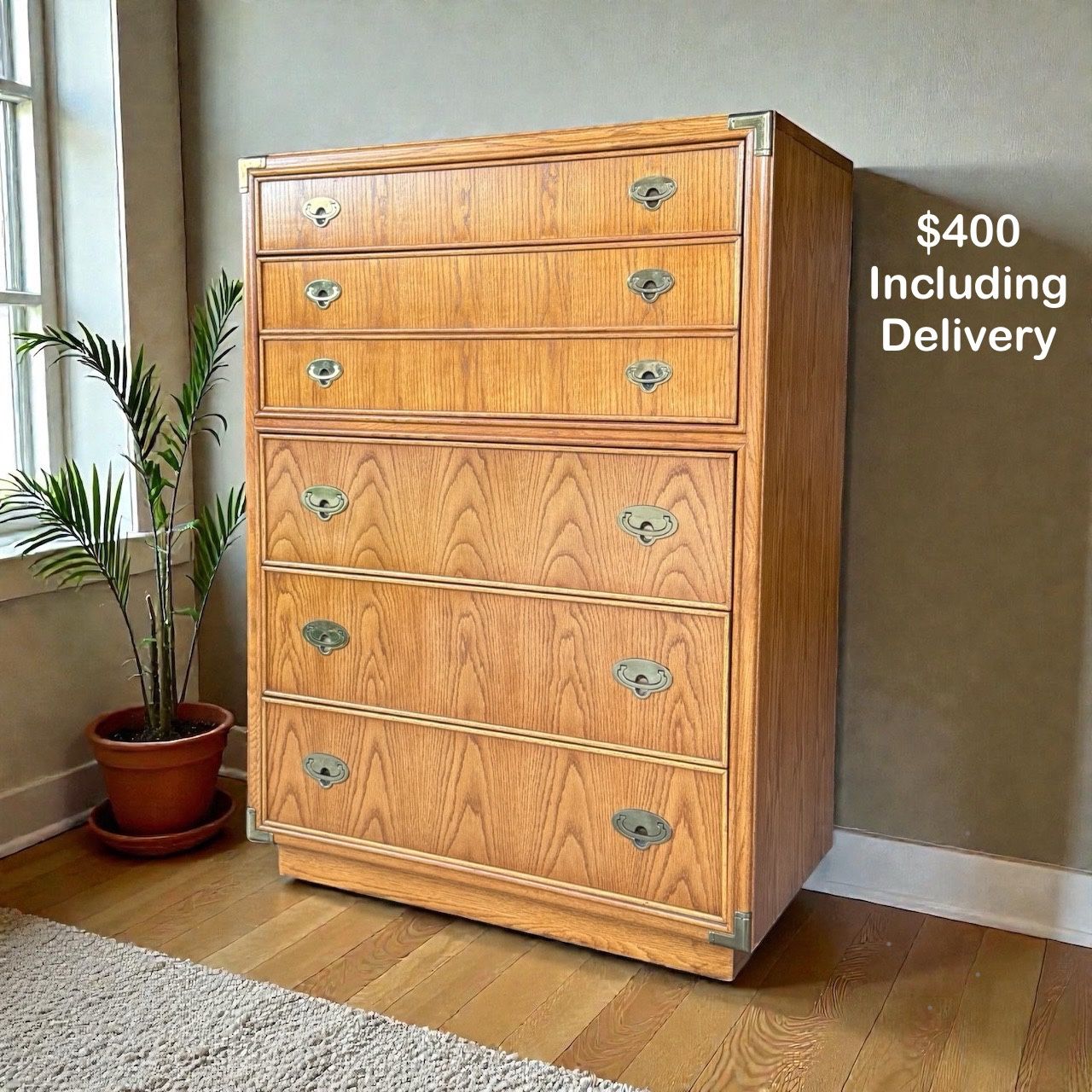Vintage Lexington campaign-style dresser in excellent condition. Solid, clean, and built to last with classic brass campaign hardware and smooth-gliding drawers. Perfect for bedrooms, guest rooms, or a stylish mid-century inspired space. π§± Dimensions: β’ 36β W β’ 19β D β’ 49β H β¨ Features: β’ Lexington Furniture quality β’ Beautiful wood grain β’ Brass campaign corners + pulls β’ Deep, spacious drawers β’ Clean inside and out β’ Sturdy and well-built π Price: $400 including free delivery within 20 miles of Lakeside Message me to schedule delivery or ask any questions!