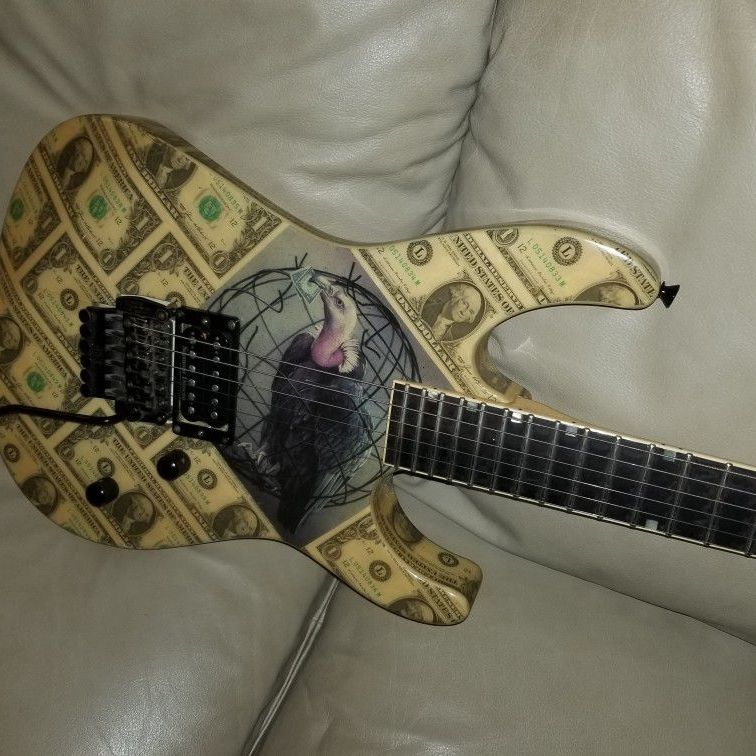 Super rare guitar here 80's metal shredders !!! New York neck plate symbolizes mid 1980's production. This guitar is covered in real $1 bills and the Eagle graphic is even more rare The production numbers on this are extremely low so grab this while you can. The original ESP pickup and volume pot died but don't worry There is a Seymour Duncan Distortion SH-6 in the bridge The volume pot is a brand new CTS push/pull so this is coil tapped for extra versatility. ESP Sinclair Double locking tremolo and locking nut