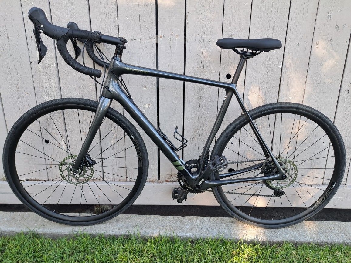 2021 Cannondale Synapse Carbon Disc 105 / LIKE NEW / NEW Gravel Tires / New Water Bottle Holder Don't miss this Opportunity this bike was $3024 NEW / Get it TODAY for $1525 Awesome bike CARBON FIBER FRAME AND FORK / SUPER LIGHT / Set up for Endurance riding with New Gravel Tires, second set of tires included / Rides super smooth, test ride TODAY! Details Go Further A road bike that's light, stiff, fast and surprisingly comfortable. Your rides will go longer. You'll barely notice. Where it thrives The open road, gravel roads, in competition What it's built for Endurance, speed, comfort Highlights - Lightweight BallisTec Carbon frameset - Shimano 105 11-speed group with Cannondale 1 dual chainring crank - Shimano 105 hydraulic disc brakes Wide Ranging Capabilities With full clearance for tires up to a whopping 3mm wide, and subtle, hidden fender mounts, the Synapse is ready and willing to explore the wilder side of endurance riding Power Pyramid Seat Tube The seat tube splits asymmetrically to meet the wide, 73mm CC30A for maximum stiffness with minimal weight Connect An integrated wheel sensor helps track your activity (like speed, distance and calories burned), registers your bike, reminds you of needed service and more, all through the free Cannondale App BallisTec Carbon Cannondale's proprietary high-strength, high-stiffness carbon construction. An advanced matrix of intermediate modulus fibers creates a frame that's light, durable and lively Fender Up Fully fender ready. A removable fender bridge on the rear stays is there when you need it, gone when you don't Geometry Sizing 56cm Specs Frame BallisTec Carbon, Di2 ready, SAVE, BB30a, flat mount, 12 x 142mm thru axle, internal cable routing, removable fender bridge Fork BallisTec Full Carbon, integrated crown race, SAVE, size-specific design, 12 x 100mm thru-axle, internal routing Headset Synapse Carbon, integrated, 1-1/8" - 1-1/8" (48 cm), 1-1/8" - 1-1/4" (51-54 cm), 1-1/8" - 1-3/8" (56-61 cm) Rims/Wheels Cannondale RD 2.0 Disc, double wall w/eyelet, 28h Hubs Front: Formula CL-712, 12 x 100mm Centerlock Rear: Formula RXC-400, 12 x 142mm Centerlock Spokes Stainless Steel, 14g Tires YUNSCM 700C Bike Tires 700x32C/32-622 Presta Valve Crankset Cannondale 1, BB30a, 50/34 Bottom Bracket Cannondale BB30 Chain Shimano HG601, 11-speed Front Derailleur Shimano 105, braze-on Rear Derailleur Shimano 105 GS Cassette/Rear Cogs Shimano 105, 11-34, 11-speed Shifters Shimano 105, 11-speed Handlebars Cannondale 3, 6061 alloy, Compact Tape/Grips Cannondale Bar Tape, 3.5mm Stem Cannondale 3, 6061 Alloy, 31.8, 7° Brake Levers Shimano 105 hydraulic disc Brakes Shimano 105 hydraulic disc, 160/160mm RT64 rotors Pedals Included Saddle MSDADA Gel Bike Seat Seat Post Cannondale 3, 6061 Alloy, 25.4 x 300mm (48-51), 350mm (54-56), 400mm (58-61)