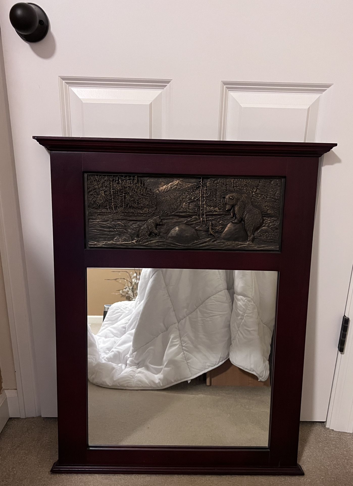 Wall Mirror with a grizzly bear and Cub Catching Salmon in a river with a mountain in the background. Mahogany - reddish-brown color. Great gift for the outdoor enthusiasts. 24” wide x 29” high