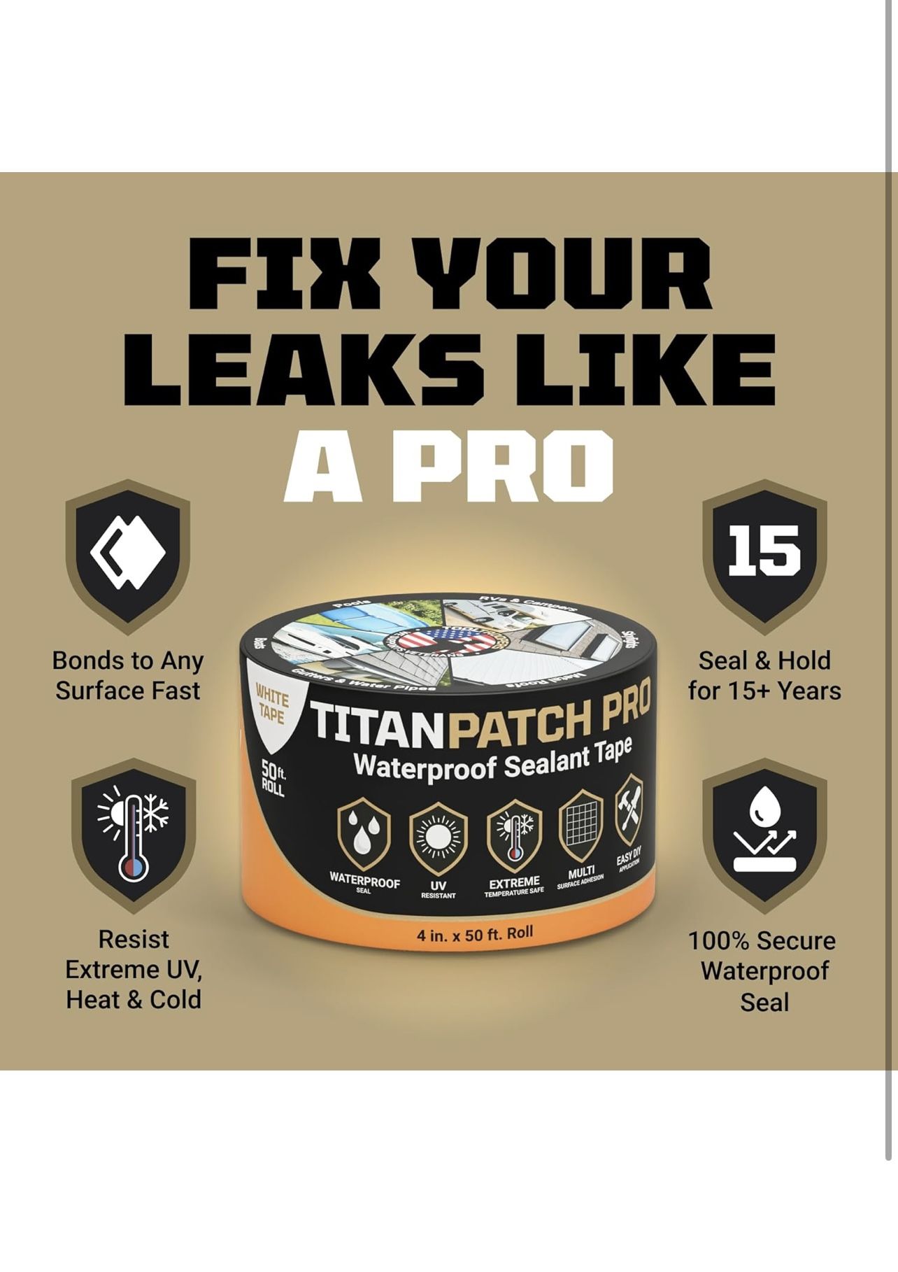 •STOPS LEAKS FAST & HOLDS FOR 15+ YEARS - You’ve got a leak. This isn’t the time for guesswork. TITAN PATCH PRO bonds instantly to rubber, EPDM, TPO, metal, wood, and fiberglass. No primer. No excuses. It seals in seconds and stays sealed for 15+ years. Whether it’s your RV roof, camper, trailer, boat, skylight, or gutter, press it once and move on. You’ve got better things to do than fix the same spot twice. •EASY ENOUGH FOR FIRST-TIMERS. BUILT TO IMPRESS PROS - No guesswork. No struggle. Just press, seal, and move on. Whether it’s your first time patching a leak or your hundredth, TITAN PATCH PRO is designed for easy use on RV roofs, trailers, gutters, and more. No experience required. With a flexible butyl adhesive and easy-release liner, you get fast, even application with lasting So if you can peel a sticker, you can seal a roofpermanently.