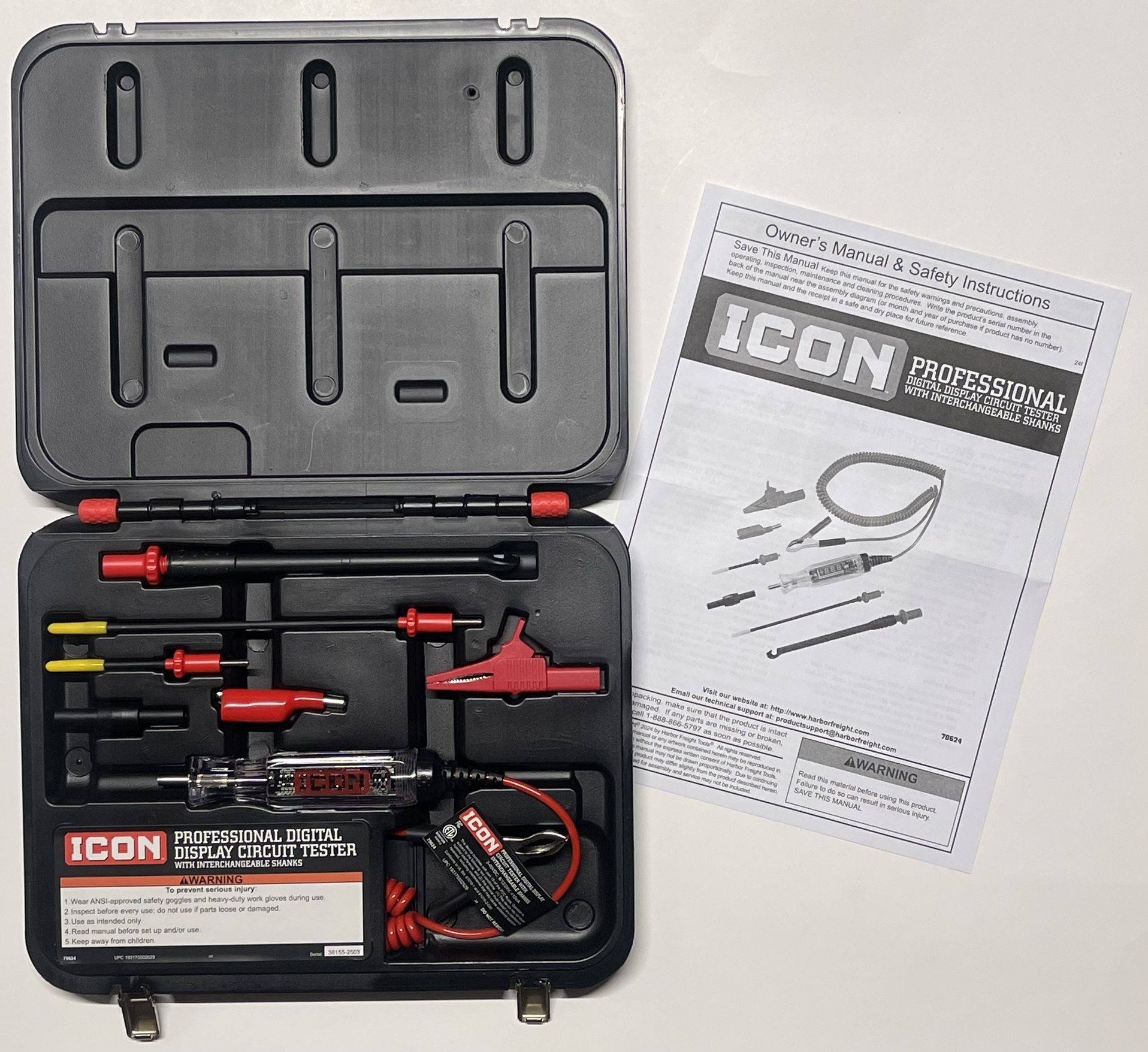 Brand new ICON Professional Digital Display Circuit Tester, item 70624. Item was never used and includes owner’s manual.