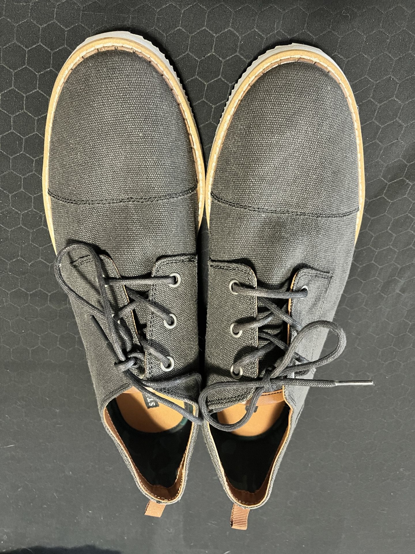 Men's charcoal grey denim Oxford style shoes by Structure with white and brown soles and a camo print inside. Brand new. Size 12.
