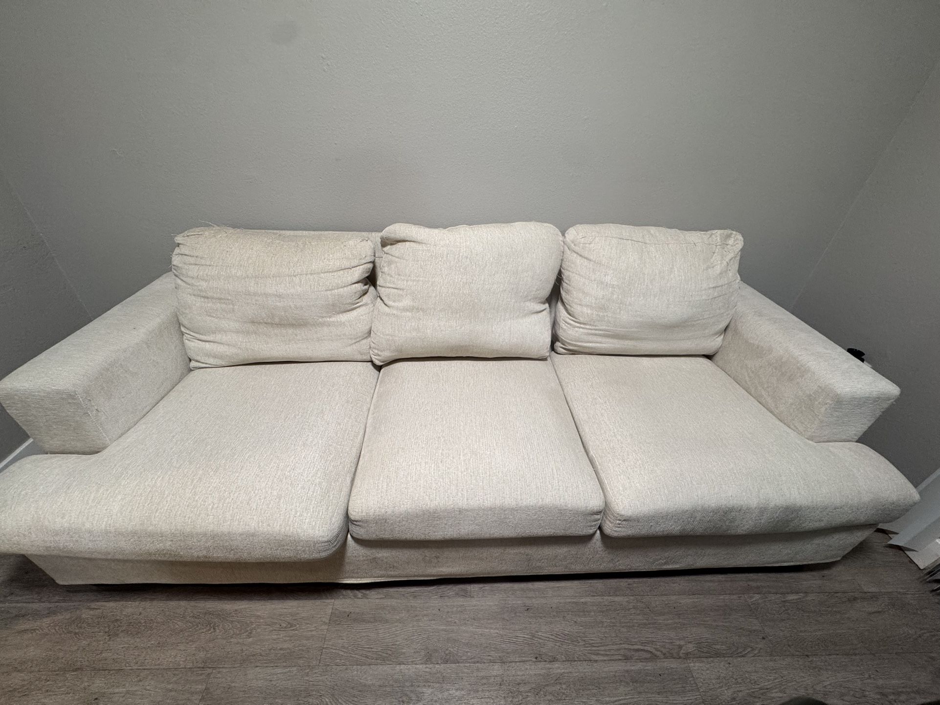 Dimensions: 36"D x 89"W x 35"H No smoking, no eating, no odor. Fabric is washable. About a year old (if that) - I'm moving across country and don't really want to haul it. Spent $550 on it- message me with offers, Price is NOT firm Color: white beige / Chenille fabric type