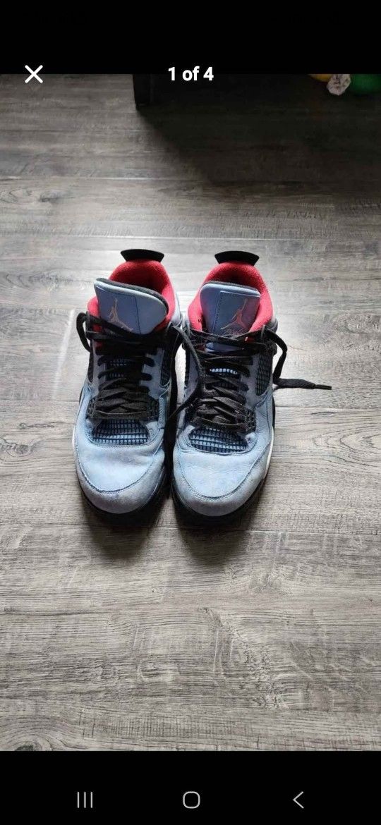 Jordan x Travis Scott Air Jordan 4 Retro "Cactus Jack" sneakers in a University Blue, Varsity Red, and Black colorway.