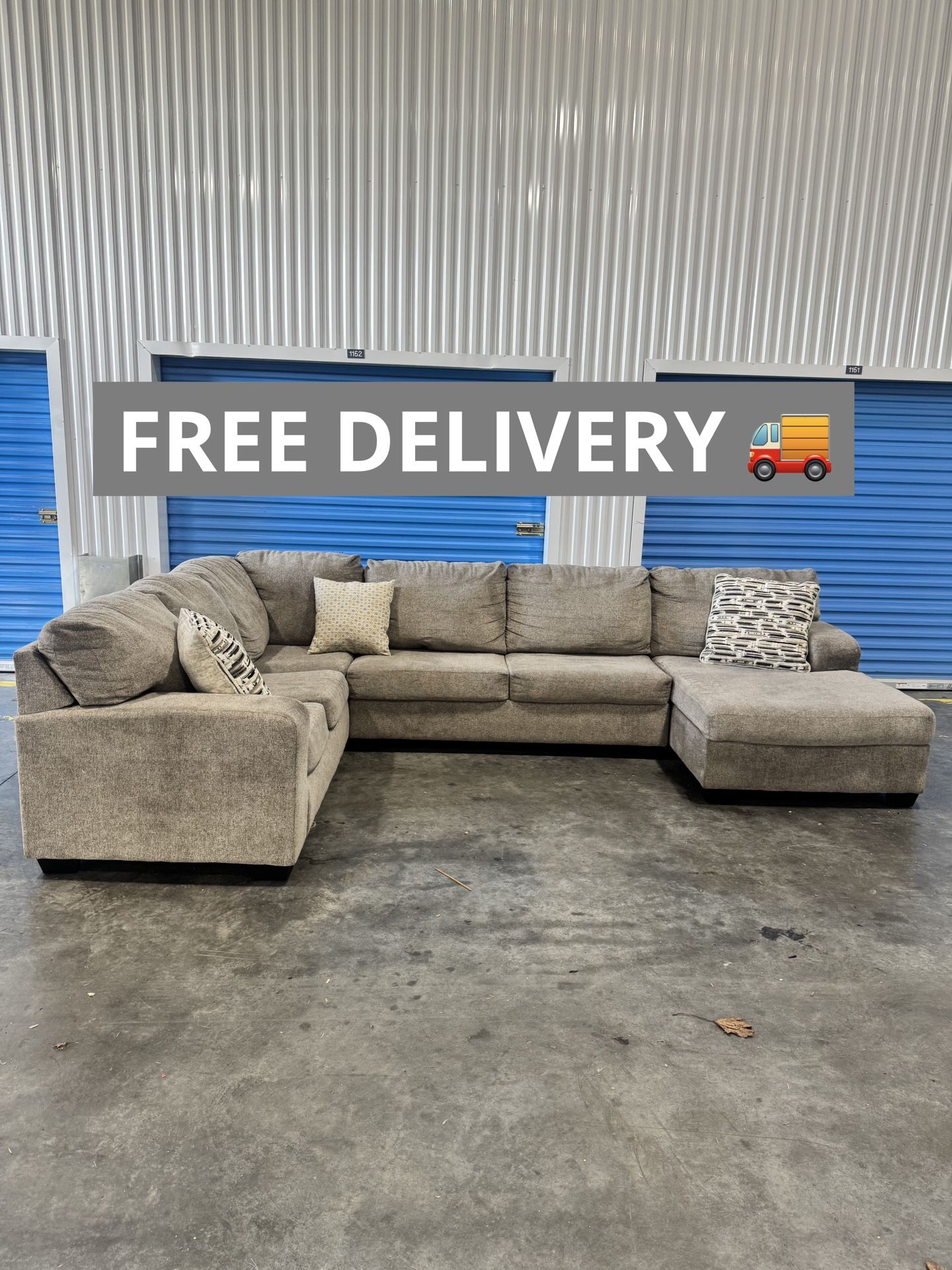 I’m offering free delivery on this Ashley’s sectional in overall good condition has some normal wear but has lots of life left! Has a little bit of tiny spots that’s about it. Cushions are removable for easy washing! Measures: 140” x 92” chase 60” I’m more than happy to offer free local delivery and help loan into your home 🏡