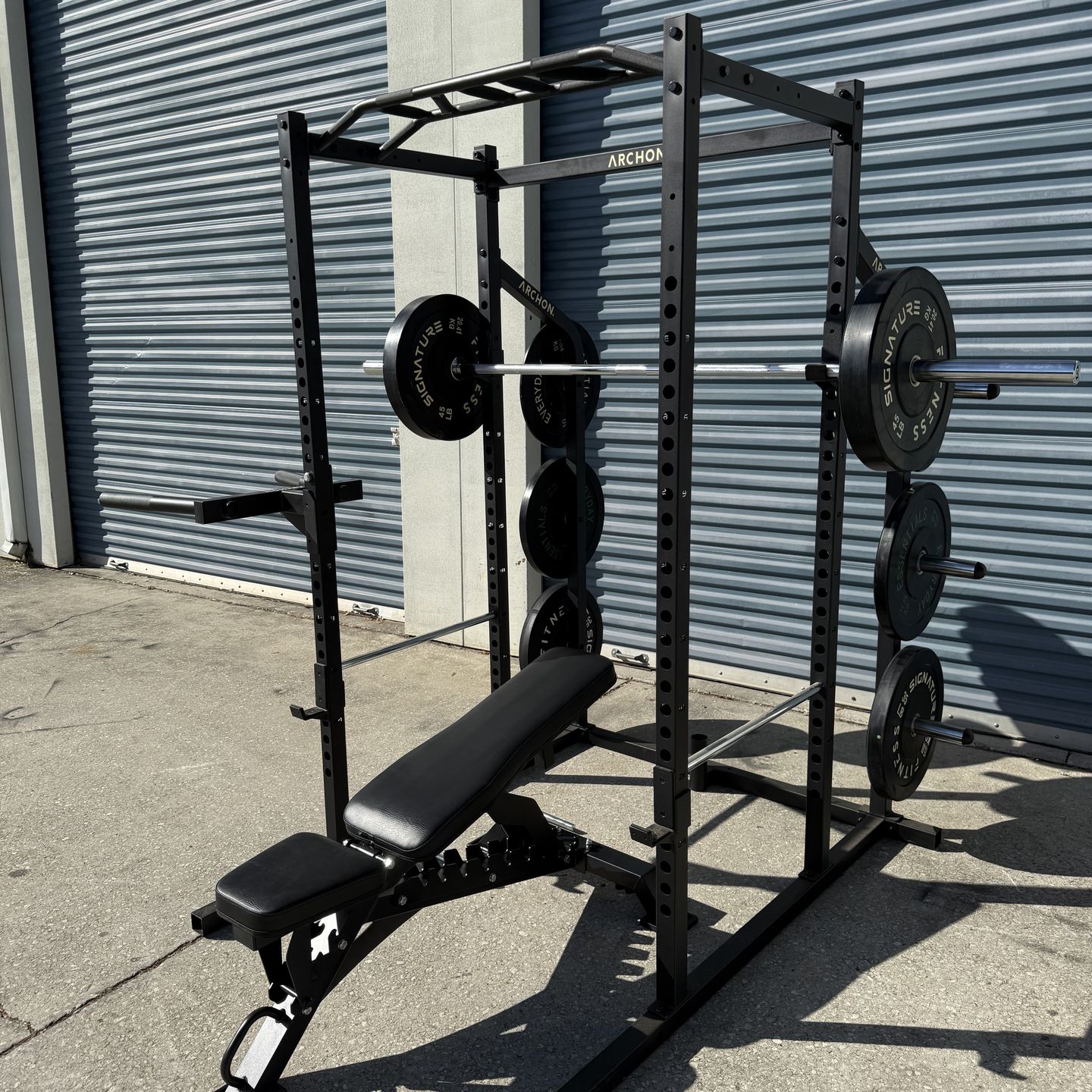 New gym equipment CrossFit. Home garage gym New in the box rack Cage rack • 1000 LBS Safety Catchers, 750 LBS J Hooks, 500 LBS Multi-Grip Pull-up Bar, 14 Gauge Steel • 27 Adjustable positions for bar and safety catches clearly marked. Olympic Bar Storage. Measures: 66.375" Depth / 65.125" Wide (Storage Posts Are Widest Point / 43.25" Interior Width / 81" Height Multi grip pull up bar Plate storage Band pegs J hooks Spotter arms Bar holder Brand New Olympic 45 lb 7' bar 2-45 2-35 2-25 2-10 all new bumpers Adjustable weight bench
