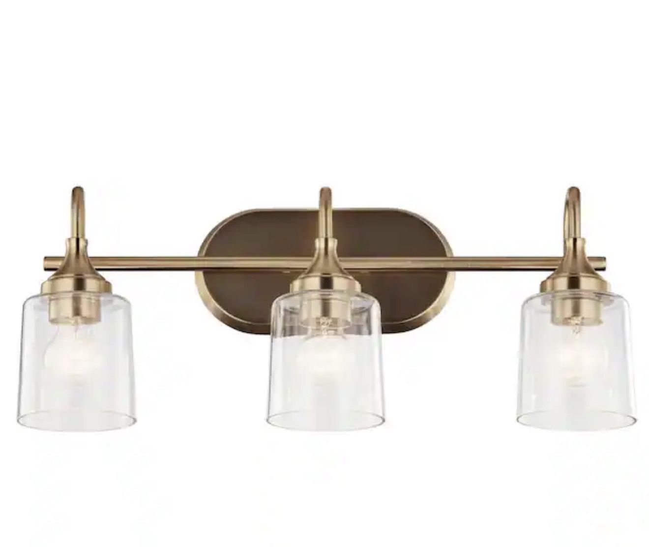 Open box - New Item -37552 Includes: 3 glass shades and mounting hardware Durable steel frame Clear glass shades Fixture measures 24 inches in length x 9.92 inches in height x 6.3 inches in depth Coordinates with a variety of plumbing and hardware lines in the Champagne Bronze finish Can be installed facing up or down Designed for easy cleaning: turn off electric current, remove glass and wipe with a damp cloth CETLus Listed damp for indoor, damp spaces