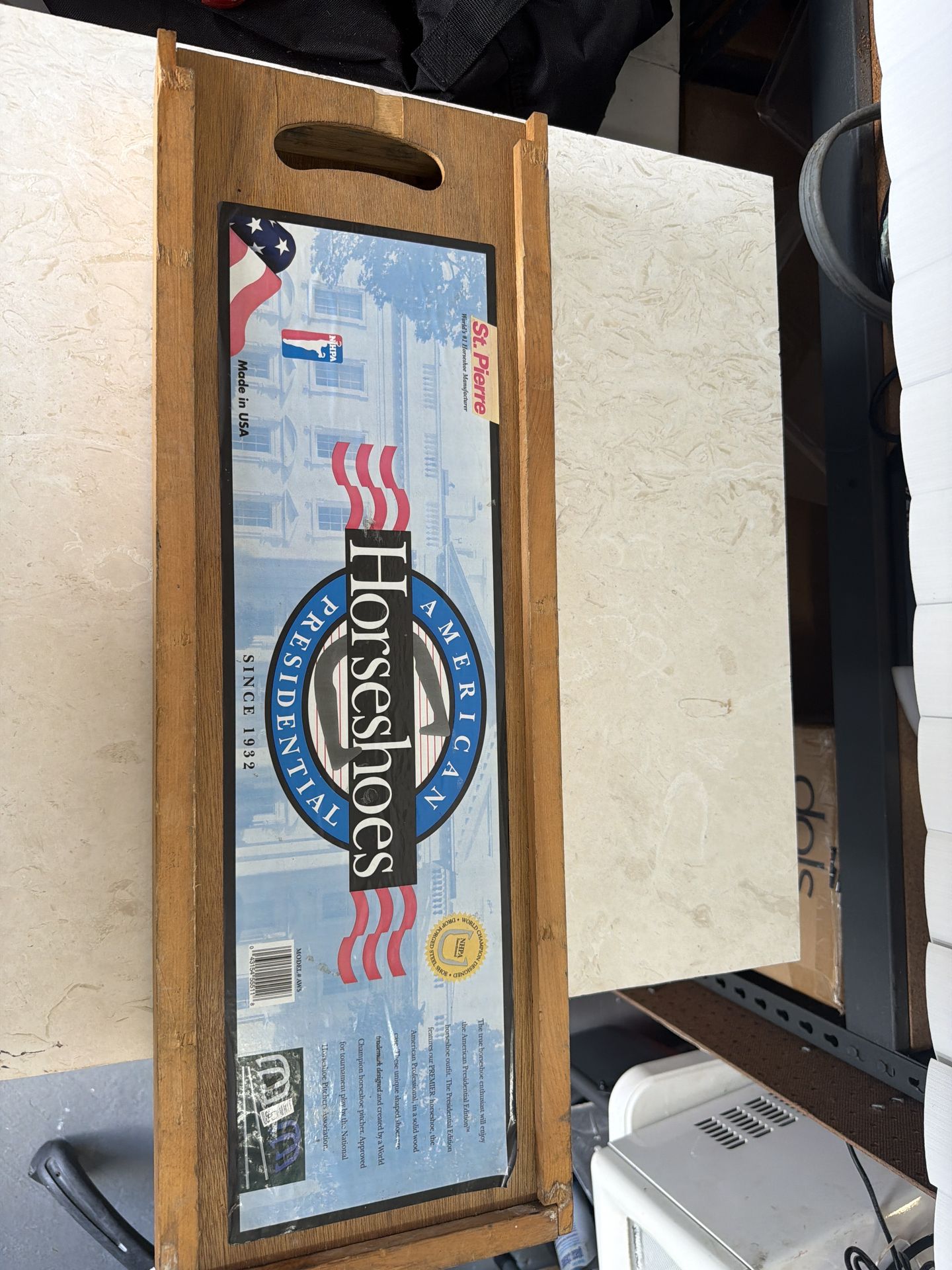 Description Official St. Pierre American Professional Horseshoe Set (Model AW5). Includes: • 4 forged steel horseshoes (2 red / 2 blue) • 2 metal stakes • original wooden storage box Made in USA by St. Pierre Manufacturing. Heavy duty forged steel horseshoes — much better than the lightweight sets sold in stores. Great for: • backyard games • BBQs • camping • family gatherings Condition: good used condition. $35 – pickup in Lake Worth