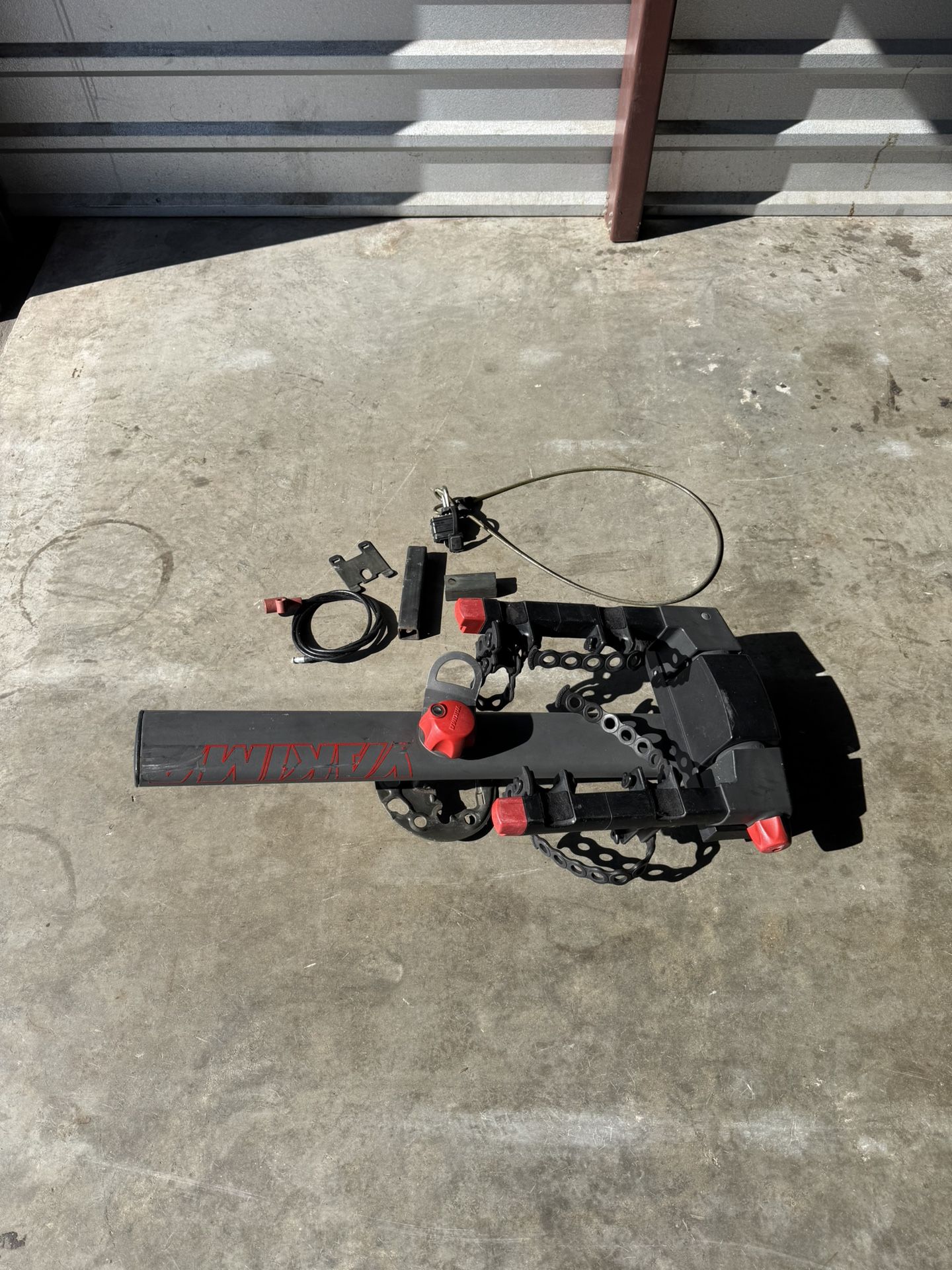 Yakima spare tire bicycle rack Holds 2 bicycles Holding arms are closable (red knob on right side) to lower it when not in use Has a bottle opener attached Comes with different size mounting brackets (depending on your spare tire width) Comes with a locking cable No longer using so it has to go Great for any vehicle with a spare tire mounted on the rear door. Jeep Wrangler, Hummer, Toyota Rav4, Honda CRV etc Pick up from my Uhaul storage unit at 350 commerce center drive Saint cloud, Fl