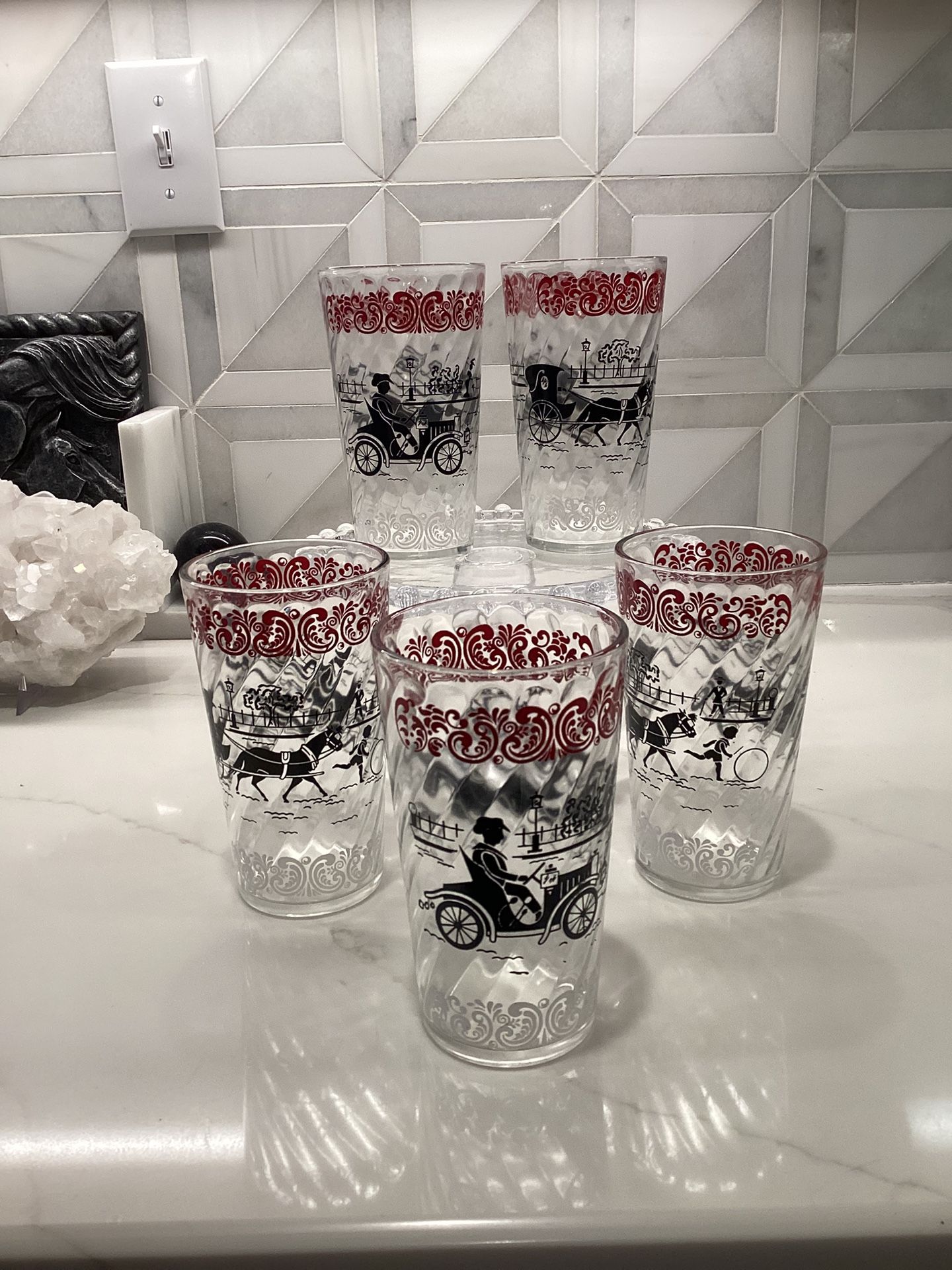 Vintage 1960’s Hazel Atlas Horse & Carriage to Cars glasses (SET OF 5) 5.75”T, 12 oz (perfect condition!)