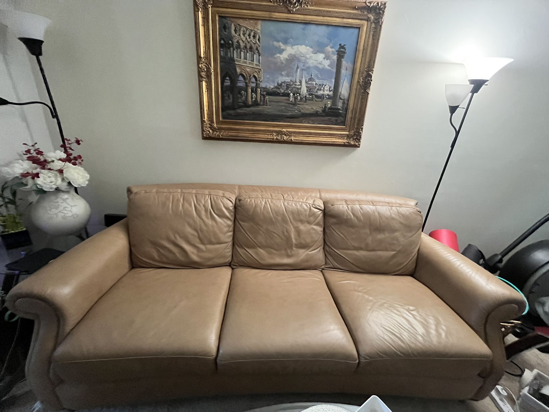 Beautiful condition and super comfortable! Only used 2 years. Beautiful and comfortable caramel couch. Would prefer to keep but just had a baby and need to replace with sectional for baby safety.