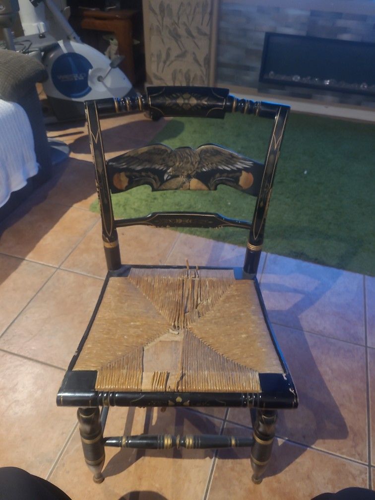 Vintage High Quality American Made Hitchcock Style Hand Painted Eagle Side Chair By Ethan Allen. Features A Black Lacquer Finish With Gold Stenciled Decoration, Including A Bold Federal Eagle Motif On The Backrest, Turned Legs, And A Hand Woven Rush Seat. A Rare Mid 20th Century Antique. Seat needs to be restored or redone. Finish is worn in the typical areas from use. Very solid chair. Use/display as is or restore it back to its original glory. Examples in pristine condition sell for over $1k. Priced according to condition. Willing to entertain reasonable offers.