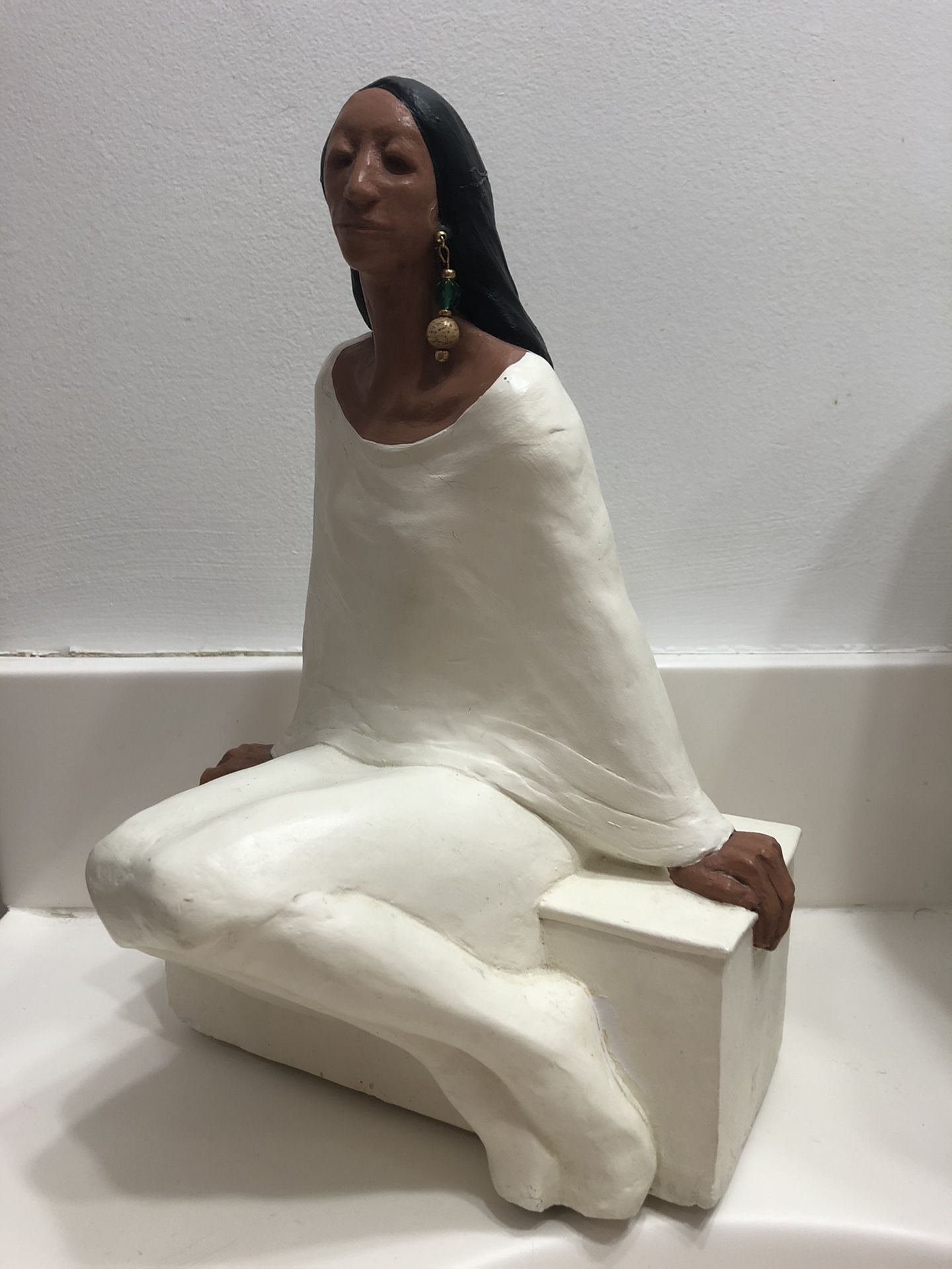 Hi! For sale is very interesting statue that portraits a setting Native American women. The statue is 11 inch tall, is made out of gypsum and weights 6.5 lbs. Moreover, this is hand-cast and hand painted sculpture art design and made in the state of New Mexico. This beautiful art of the important part of the US history will be a nice decoration to any home. The only one thing is missing is one earring. Just selling part of my personal collection.