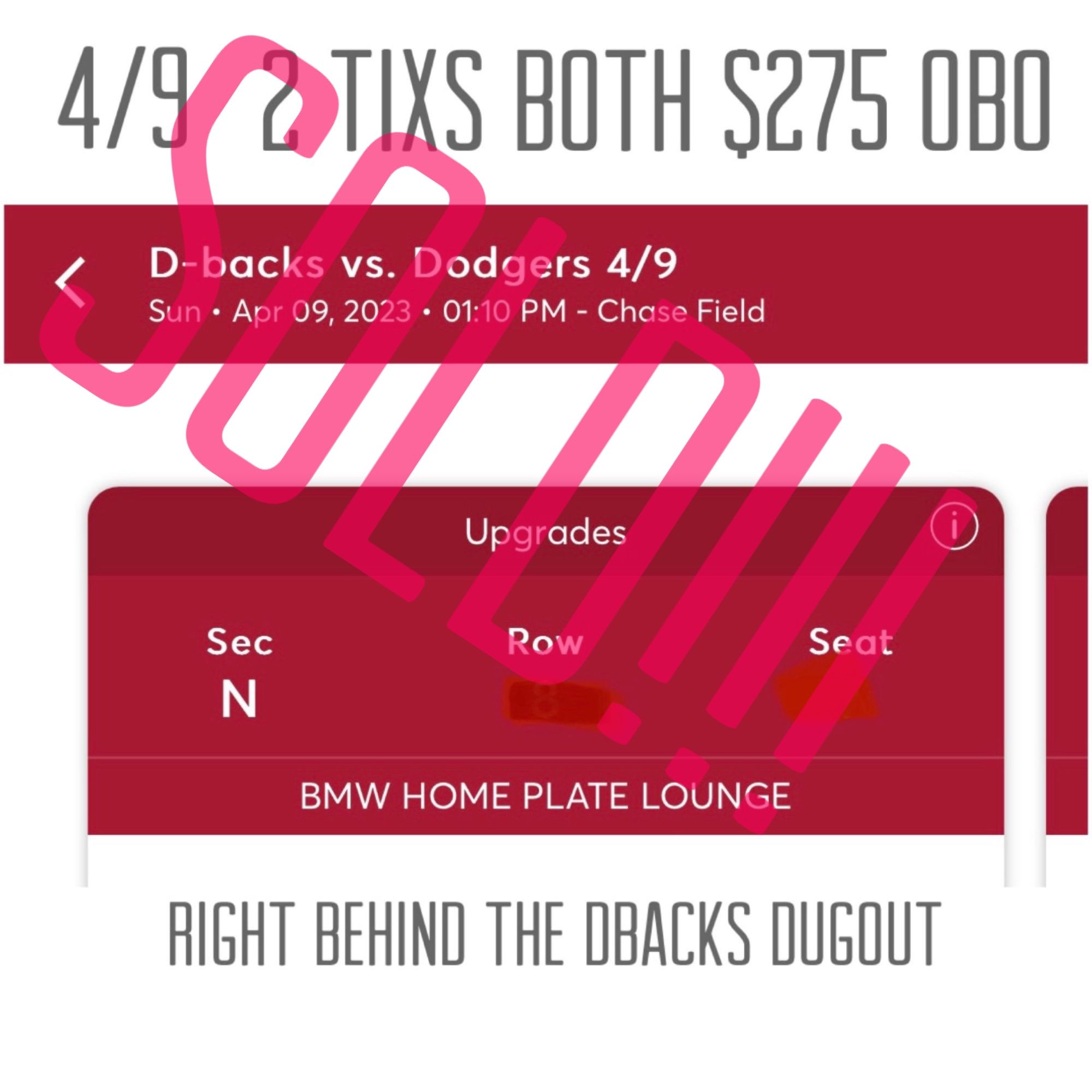Selling my tickets for Arizona Diamondbacks Vs LA Dodgers. These seats are behind the AZ DBacks dugout. Reg price in this sec is $165 for each ticket plus fees and taxes. Only have 2 tickets. Selling both tickets for $275 obo thank you for looking at my ad