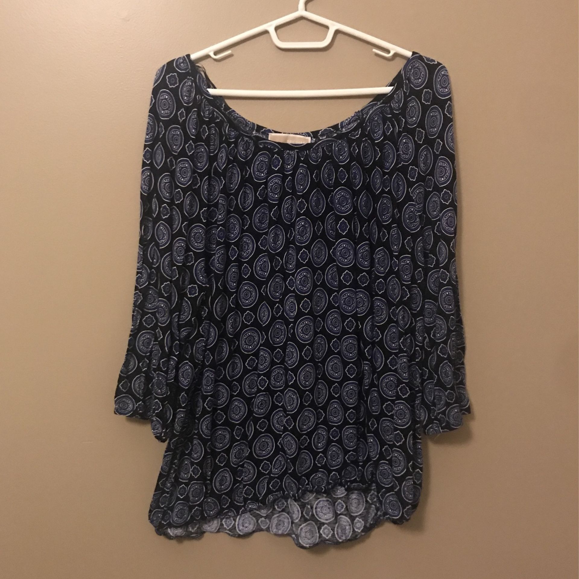 Size 2X Michael Kors blouse. Colors are navy blue and a lighter royal blue and white. Front hem is slightly higher than the back hem. Sleeves are three-quarter length and hem line has slight elastic as do the sleeves. Scoop neckline. Check out my other auctions for a ton more Michael Kors T-shirts and work blouses. PM me with any offers for a bundle and combined shipping price.