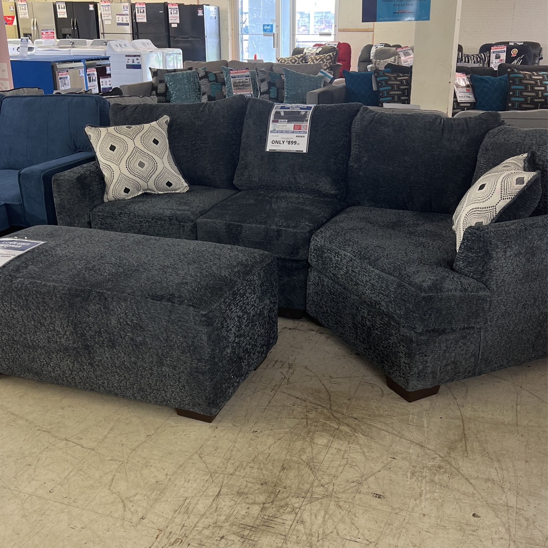 Aspen cuddler in stock ready to be taken home today! Matching ottoman available for $299.99, financing available, no credit needed take it home with $54.13 when financed