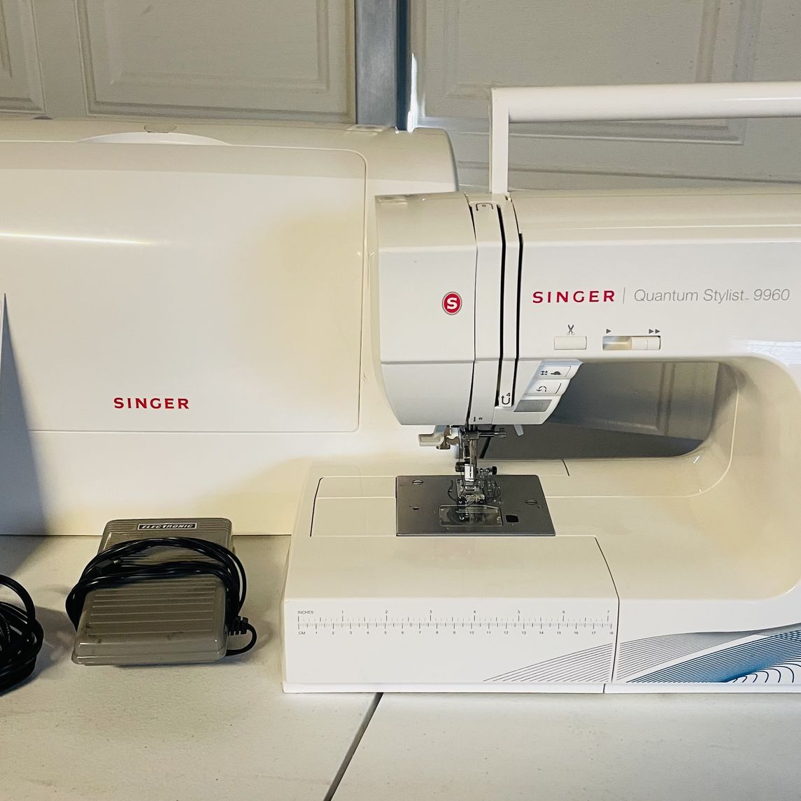 Singer Quantum Stylist 9960 Sewing Machine Basic Features: 1172 Stitch Applications 600 Built-in Stitches 5 Built-In Lettering Alphabets Mirror Imaging 13 One-Step Buttonholes Built-In Needle Threader Top Drop In Bobbin Built-In Thread Cutte Thread Cutter Shut Off Tie-Off Button Drop Feed Direct Selection Stitches Adjustable Stitch Length Adjustable Stitch Width 7mm Self-Adjusting Tension System Reverse (Touch Button) Heavy Duty Metal Frame High Speed Stitching (850/min) Speed Control Start/Stop Button LCD Screen Free Arm Snap-On Presser Feet 25 Variable Needle Positions Twin-Needle Function Dimensions: Machine Size (17.2 x 8.2 x 12) Machine Weight (18.2) Box Size (20 x 11 x 18) Amps (0.46) Watts (55) Volts (120) Hz (60)