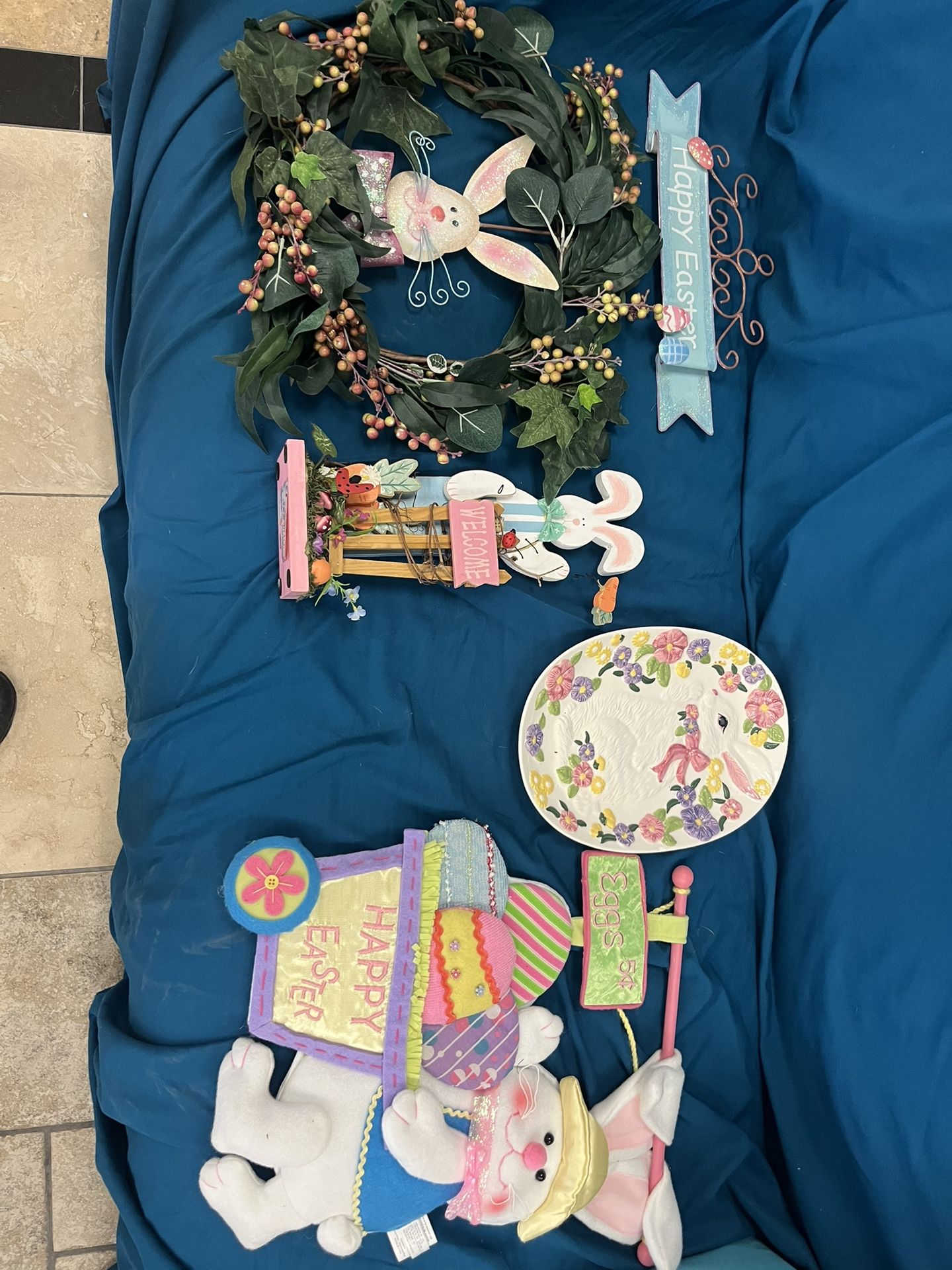 Easter decorations $5each Happy Easter wreath with metal bunny Welcome wood standing bunny Floral bunny serving dish Felt wall / door hanger bunny with a wheel barrow full of eggs Holiday decorations rabbit indoor outdoor ceramic flowers spring dish plate decor