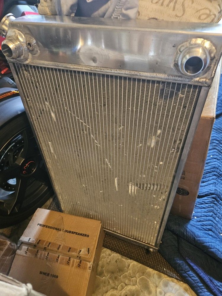 20an welded bungs and a 20an vibrant braided radiator hose with chrome earls 90 degree fittings.. radiator has a small leak, but it's fixable. 33w/19h/28inch core
