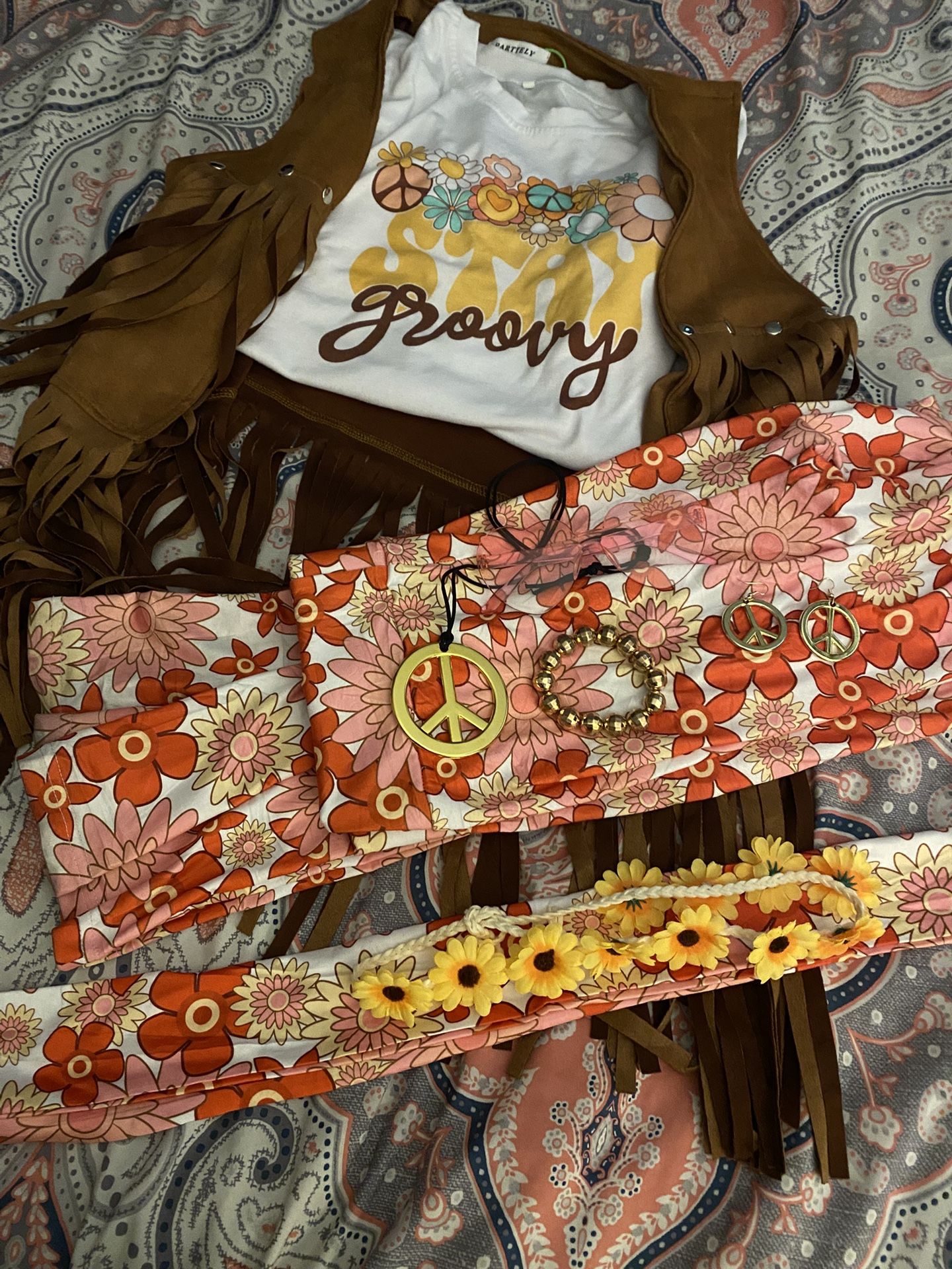 Women’s complete size large hippie Halloween costume with shirt vest bellbottoms, glasses, necklace, bracelet, earrings, headband, and flower headband