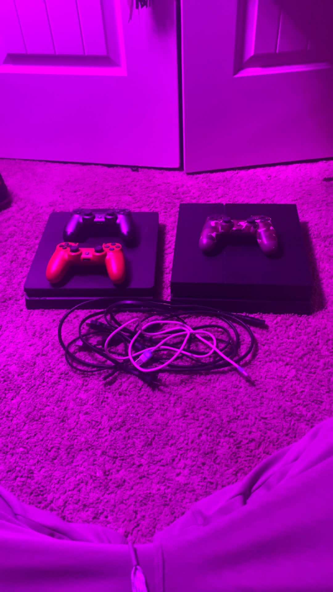 Both have wear and tear but both work fine the one on left used to have stickers on top but both work perfectly and has been updated and ready to play(unfortunately it only comes with one power cord and hdmi) but it has two chargers and 3 controllers (no shipping)