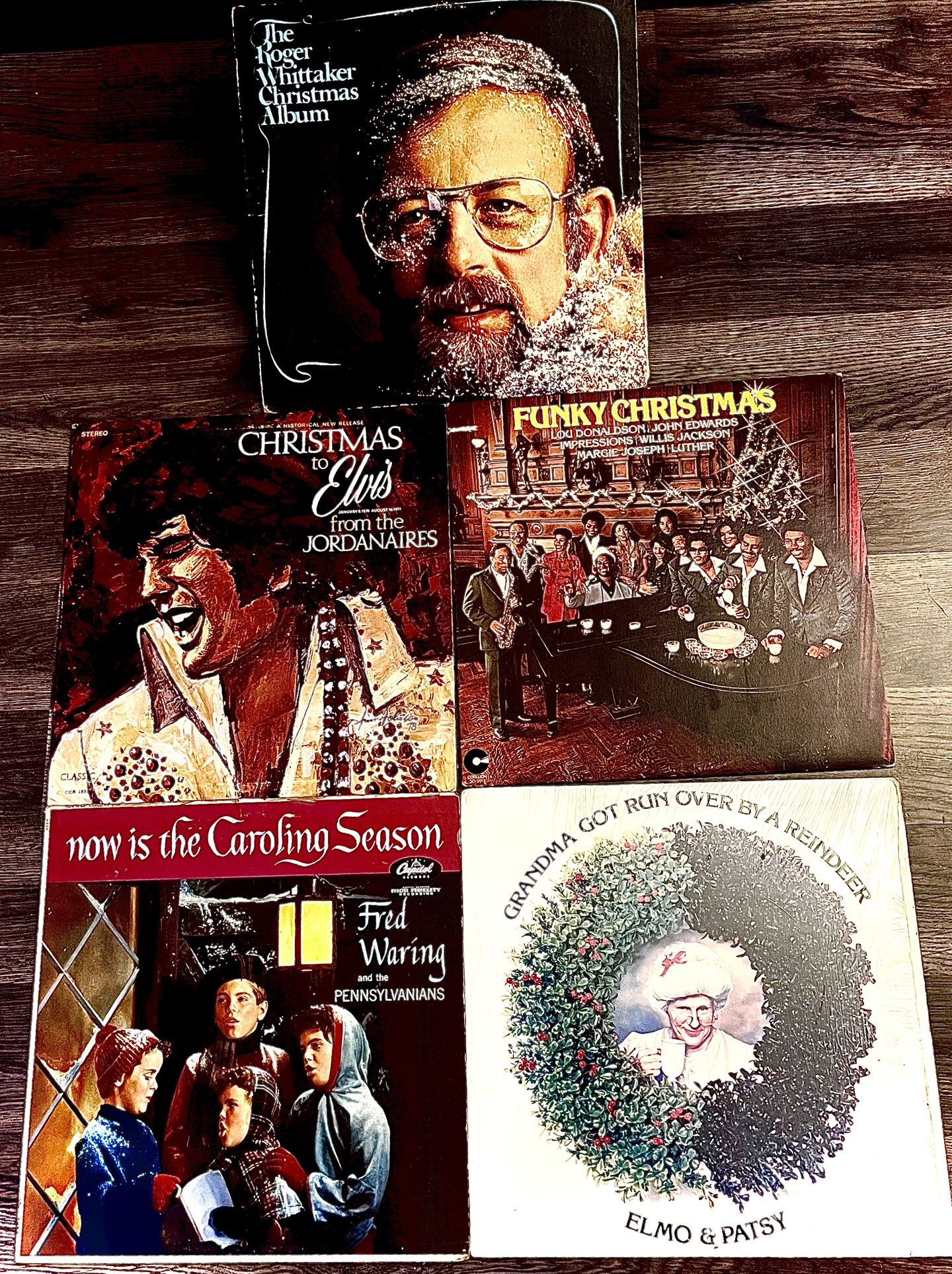 Roger Whittaker the Roger Whittaker Christmas album 1978 vinyl is NM Elmo and Patsy grandma got run over by a reindeer 1984 still in shrink vinyl NM Various artist, including Luther Vandross and the Impressions Funky Christmas 1976 vinyl NM Christmas to Elvis from the Jordanaires 1978 vinyl NM Various artist, Merry Christmas Vinylis in good condition. There are some scratches everything appears to be surface scratches but they are noticeable This album I did not consider in pricing is basically a freebie .