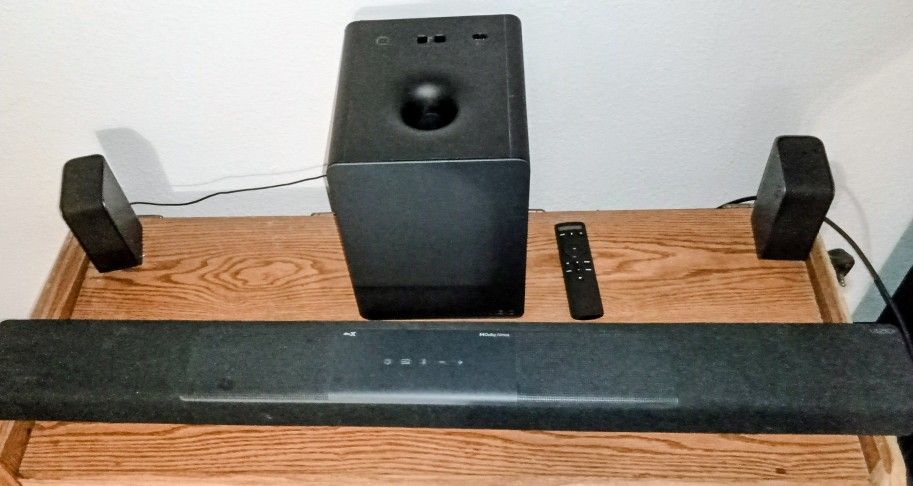 Super nice surround sound system, very few cords, comes with remote and eARC HDMI cable. Way less than anywhere online (see pics)