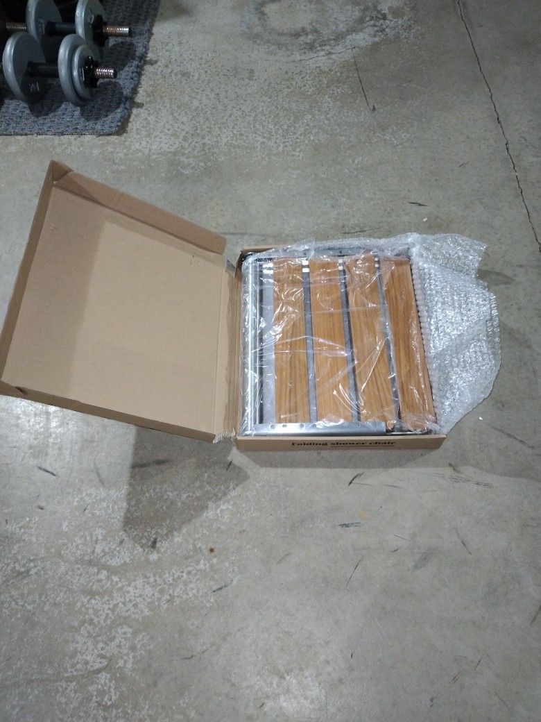 Brand new still in box stainless steel heavy duty frame with teak wood seat and back. All of mounting hardware and instructions in box. Excellent seat if you want one for the shower.$110 brand new will sell for $50