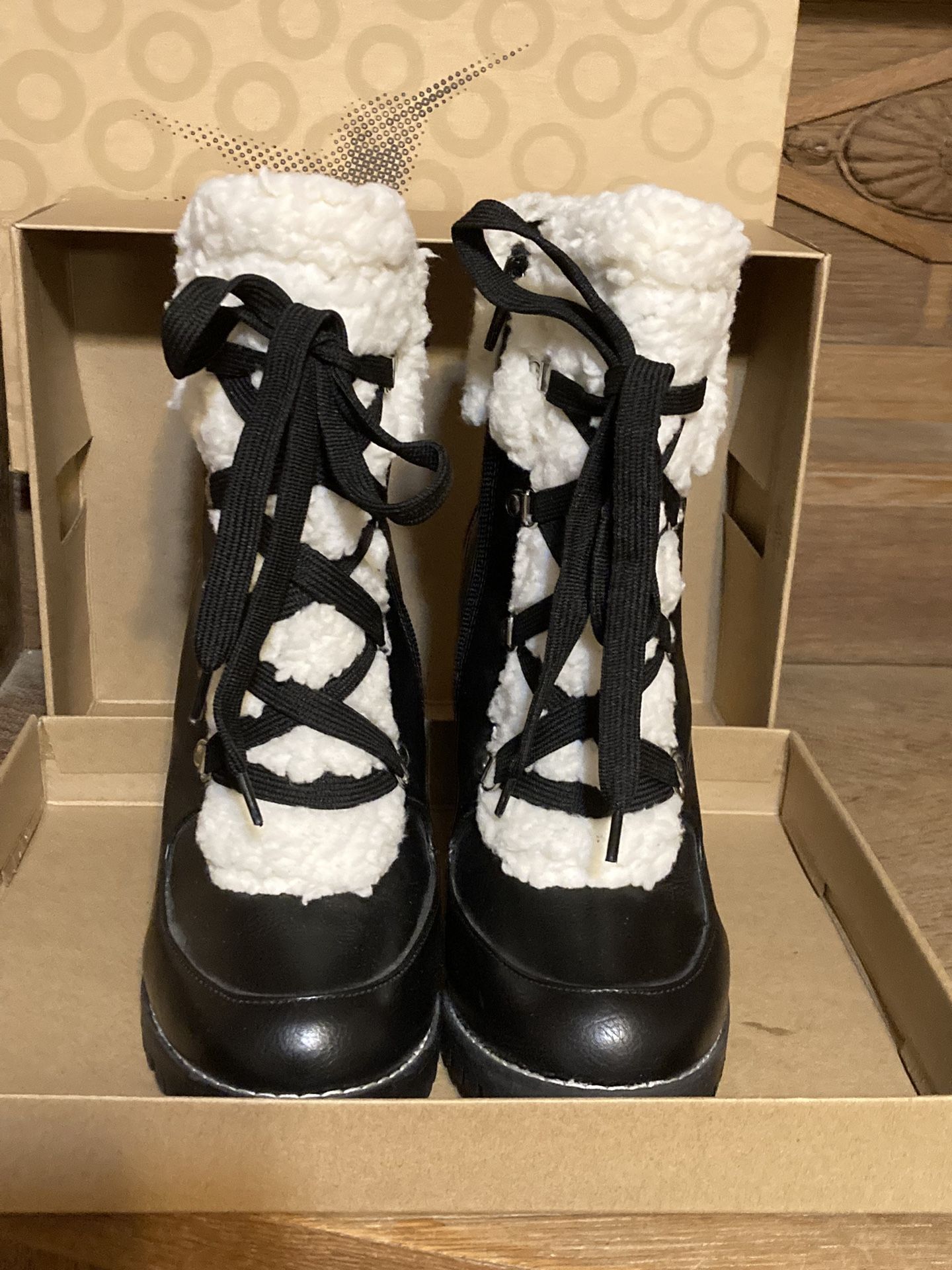 Laced up booties with zipper for convenience. Very chic and sexy! Willing to trade for other like new lower heels (no pets/smoker) home. Thanks for looking!