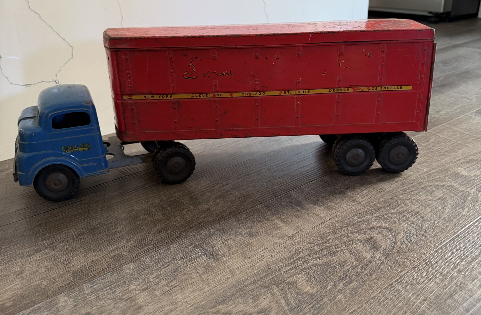 1950s Structo Transport toy truck and trailer, likely model No. 700. Made by Structo Toys, out of pressed steel; Blue cab and red trailer with faded route markings listing cities like New York, Chicago, and Los Angeles. Located in the University Heights area