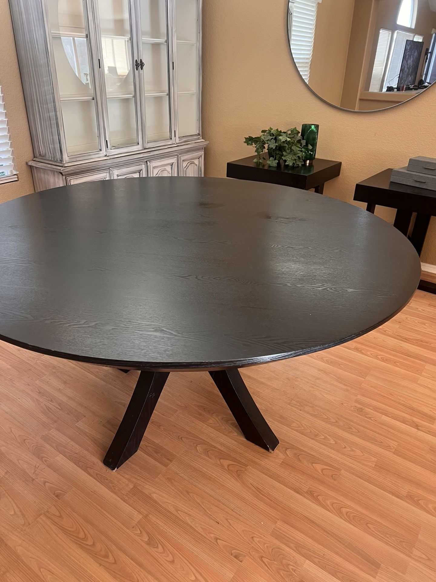 The Palma 60" Round Dining Table is an excellent addition to any home. The exquisite architectural base and hand stained finish come together and create a perfect masterpiece that incorporate elements of traditional and contemporary style allowing it to be an everlasting table that will never go out of style. The dining table is available in a beautiful Ebony Oak finish. It can seat up to 6 people comfortably and is perfect for family dinners. The top of the table measures approximately 2.5 inches in thickness. All in all, this dining table is guaranteed to amaze your guest. (Also available in 72")Details: -Dimensions: 60 in. Diameter x 30 in. Height-Seats up to 6 people-Weight: 140 Ibs.-Minor Assembly Required; Base and Top ship on separate boxes-Made from MDF and Wood Oak Veneer-Made