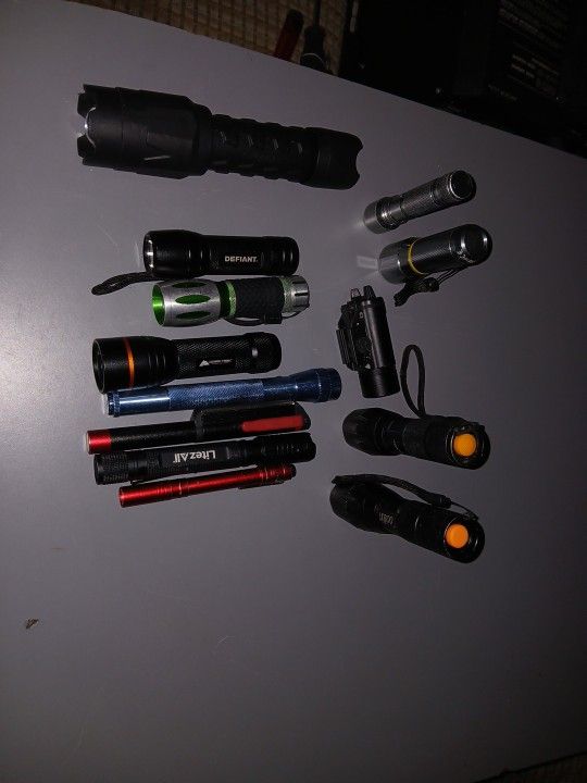 Some of these are new some are used. The strange looking smaller one it's for mounting on a pistol. They need batteries except 2 I converted to 18650 batteries and they both have full charged 18650s in them. 25 for all of them.