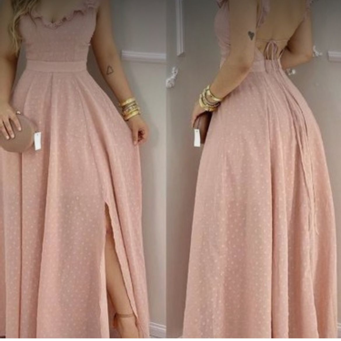 Ruffle hem, open back, long Maxi dress w/slit on side Size: XL Color: Coral Lines dress Condition: New with tags! Quantity: 1