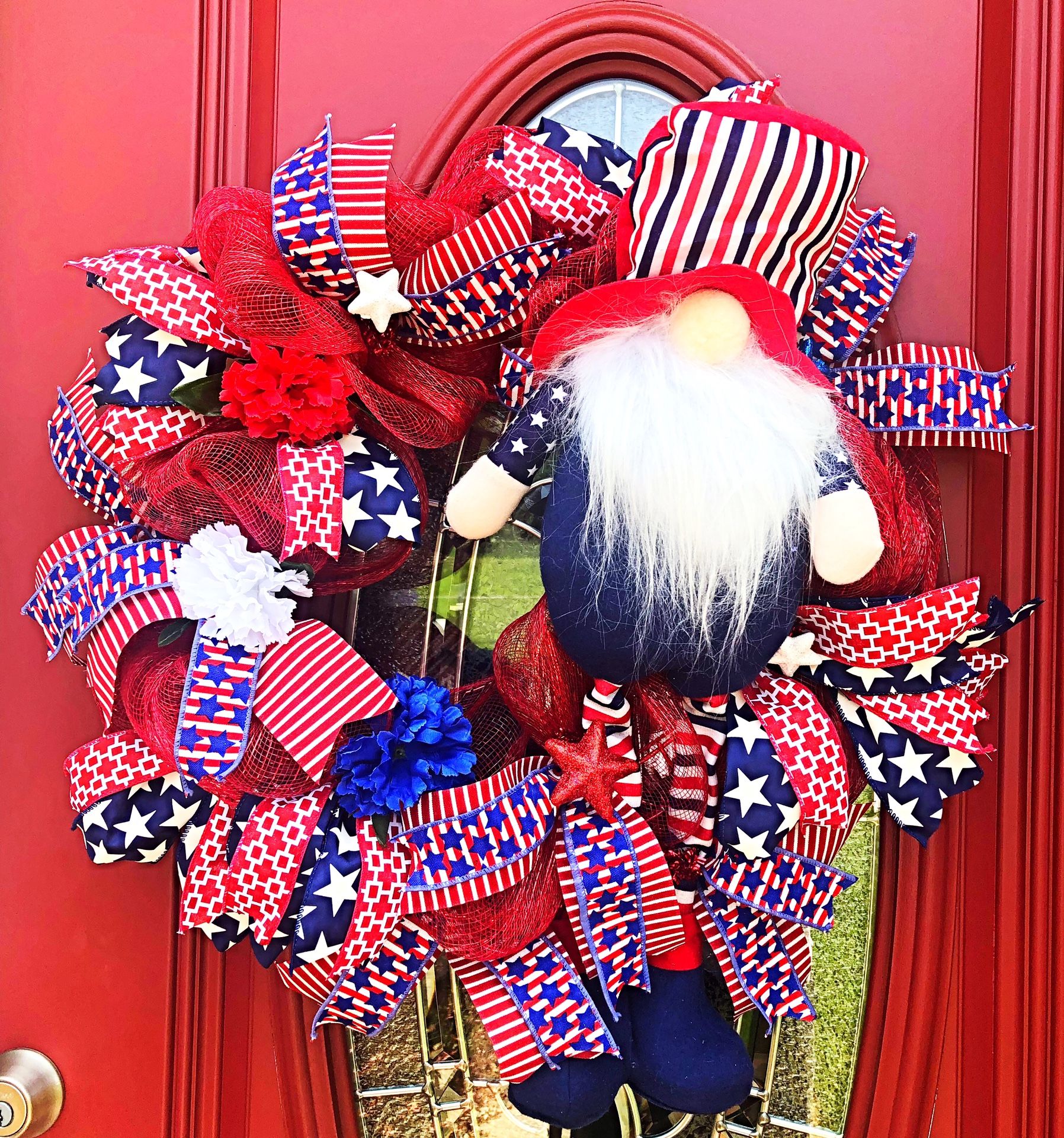 This unique hand designed wreath is ready for all Patriotic holidays! It’s made of red mesh, coordinating ribbons and a Patriotic long leg Gnome.