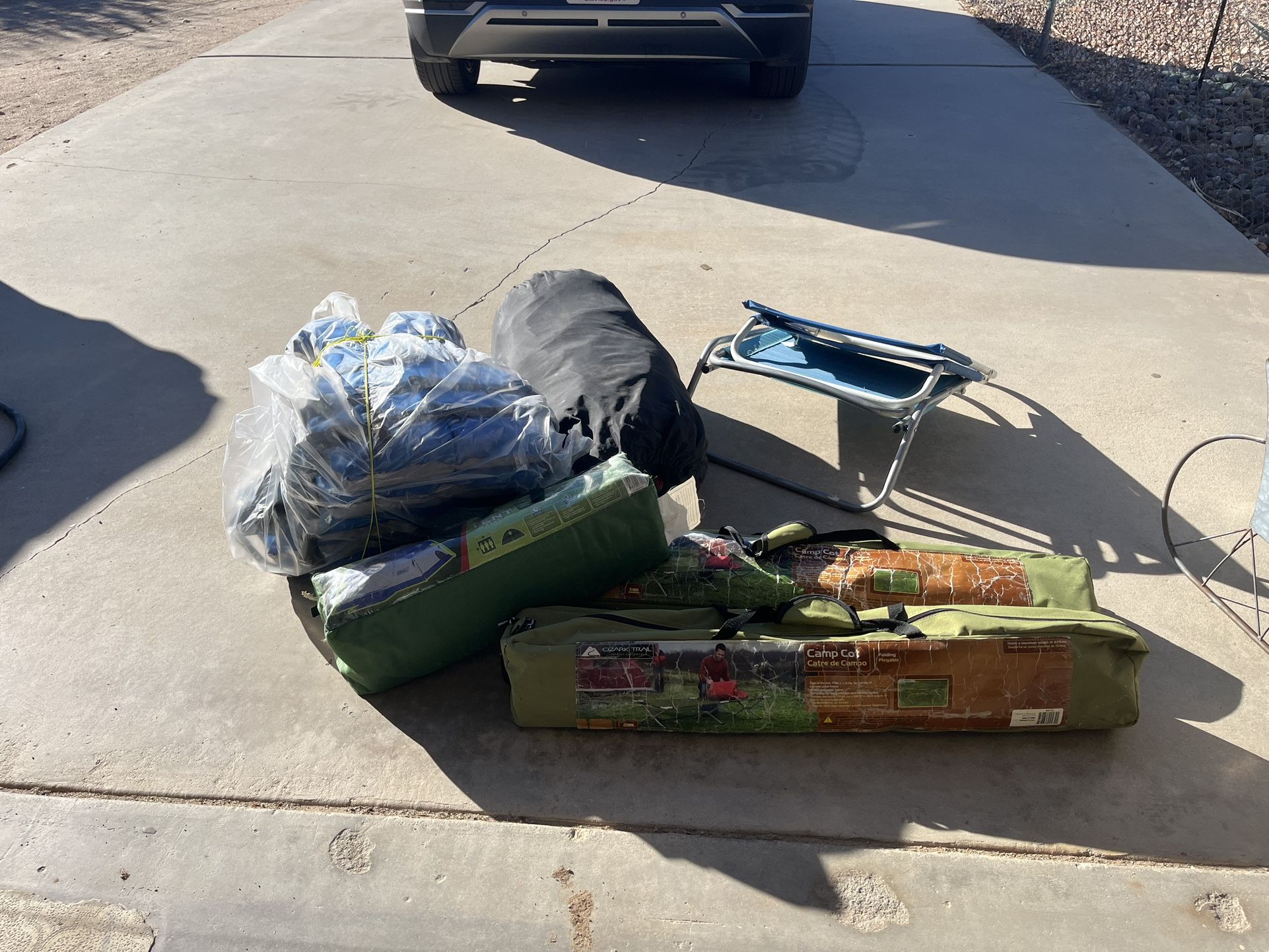 3 person tent, 2 camping cots, 1 sleeping bag and two beach chairs.