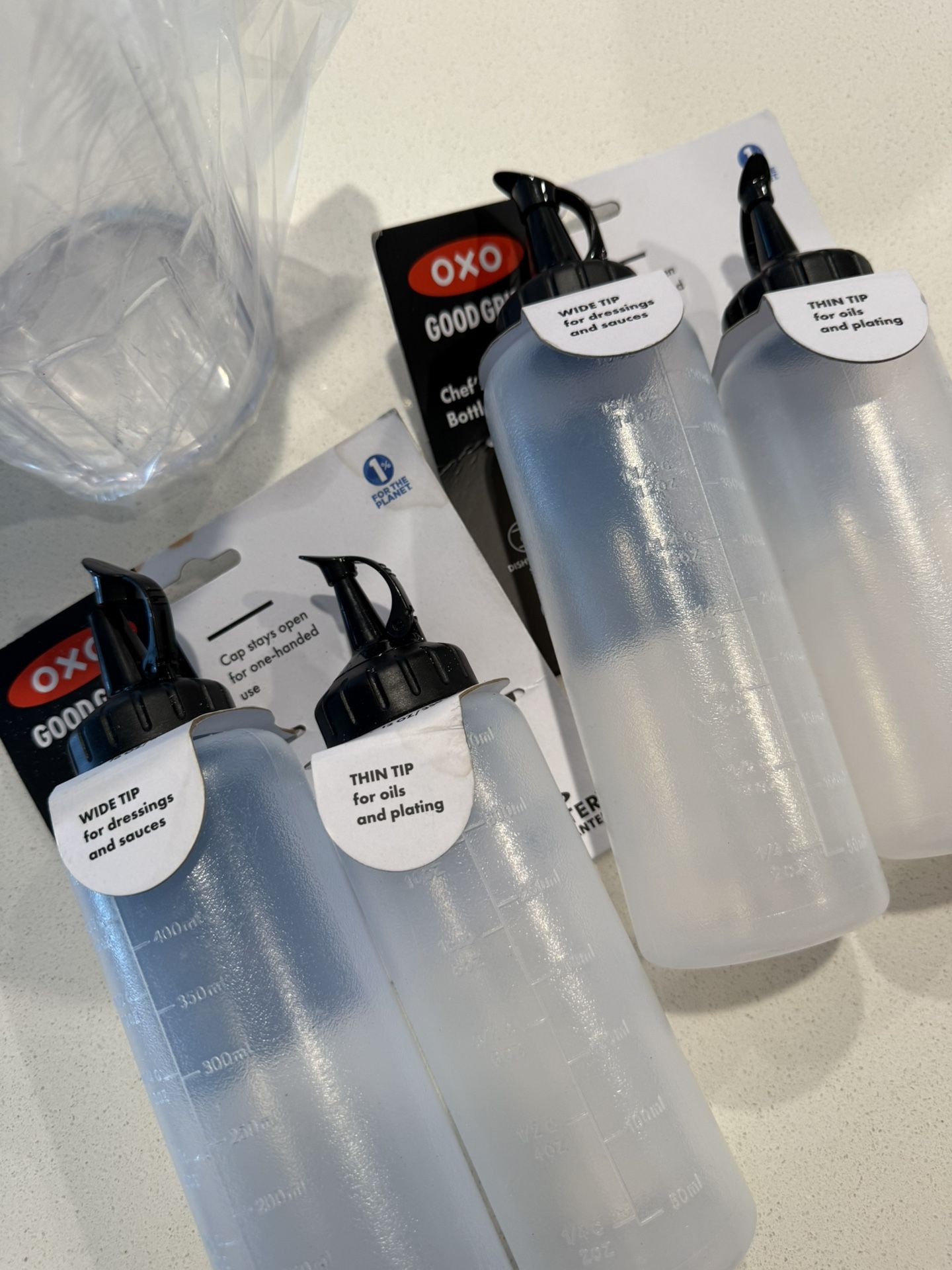 Brand new never used OxO brand sauce bottles and a drink pitcher.