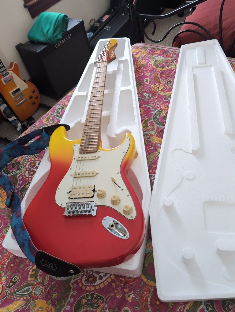 Check this guitar out on YouTube, It's actually very highly praised. The only drawback was the dots on the neck because they're paraloid blue, but aside from that it's rated every bit as good as this Squier or a Mexican fender, It was also praised for its playability in quality build. I actually could sell this for more and I know it This is brand new roasted Maple neck, two single coil pickups overwound humbucker tremolo bridge Adler body gradient paint job great tuners stays in tune. If you want this and you want a hard case, it's 160