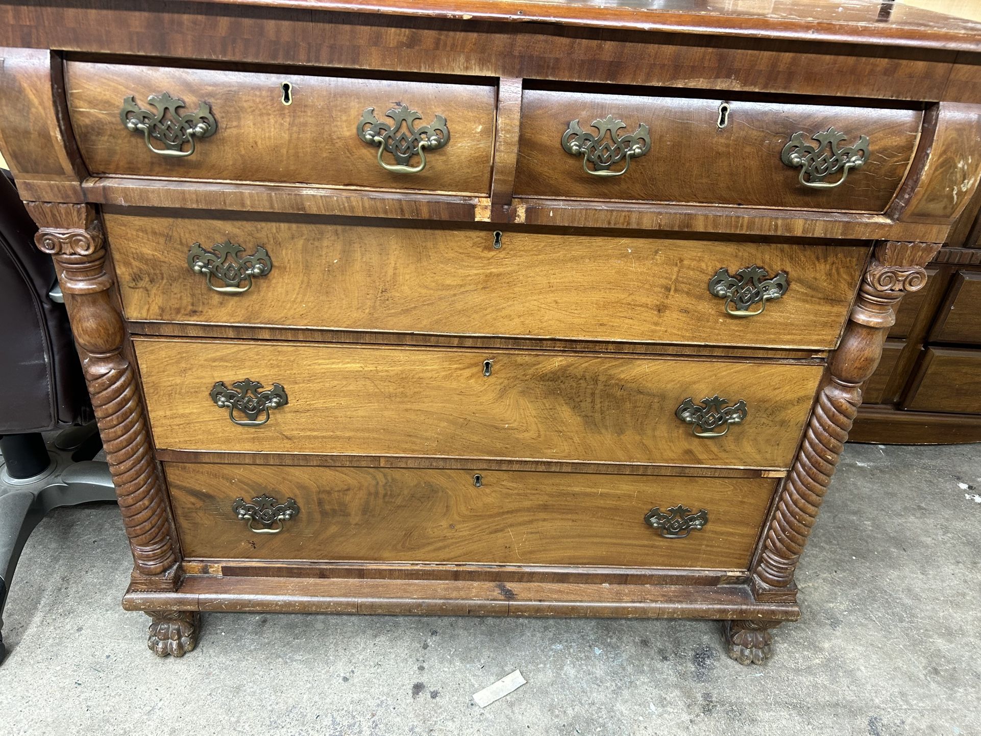 $1,000 OBO (reasonable offers accepted). Comparable Victorian walnut dressers retail for significantly more at antique shops. A beautiful and authentic late-19th-century Victorian dresser, circa 1(contact info removed)crafted in solid American black walnut with a graceful serpentine (bow-front) façade. This piece retains its original hardware, locks (several locks are missing) and rich aged patina. Features • Solid American black walnut construction • Elegant serpentine front with book-matched drawer grain • Original ornate brass bail pulls and escutcheons • Hand-turned spiral columns with carved capitals • Claw feet, typical of high-quality Victorian furniture • Thick, solid drawer construction (no plywood) • Warm, naturally aged finish with beautiful character Condition Good antique condition consistent with age. Minor surface wear, small marks, and finish variations are present and appropriate for a 130–150-year-old piece. No structural issues. Drawers open and close well. Finish has not been stripped or altered, preserving original. Serpentine walnut dressers of this quality are increasingly hard to find. Dimensions Width: 44” Depth: 21.5” Height: 40.5” Pickup only. Will require help to move.