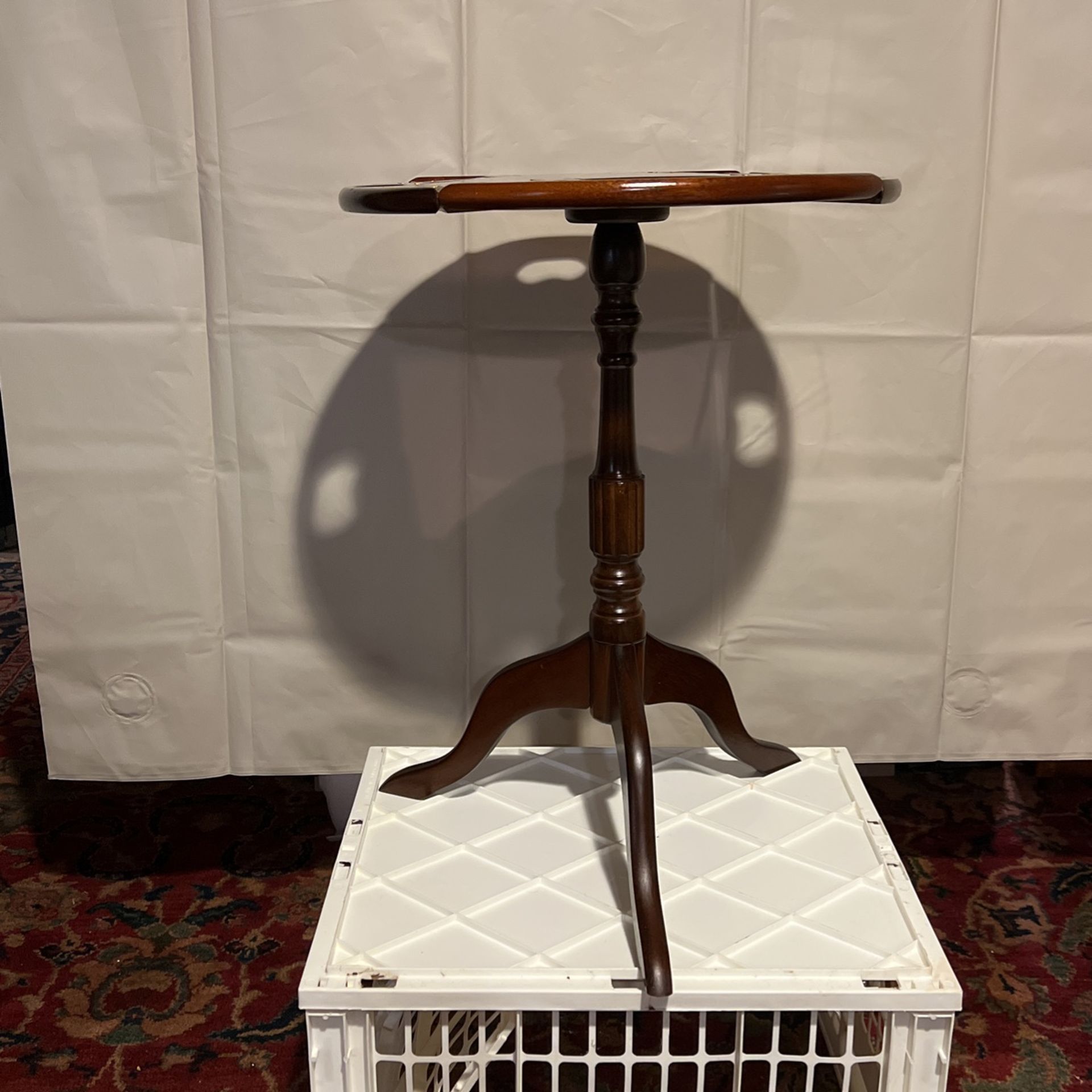 Antique tray table beautiful mahogany finish Made in Tiawan sold in New Orleans. There is one small scratch on top isn’t that noticeable. The table has been used here primarily a plant stand